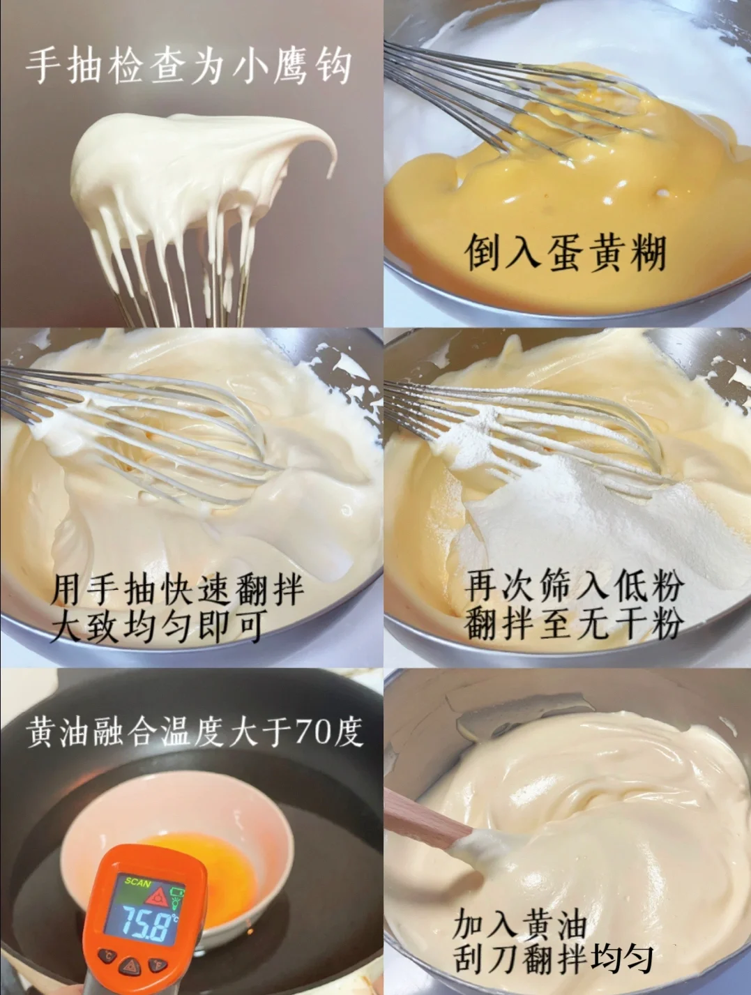 📎蛋黄糊要打发充分,混合蛋白霜大致均匀即可加入面粉