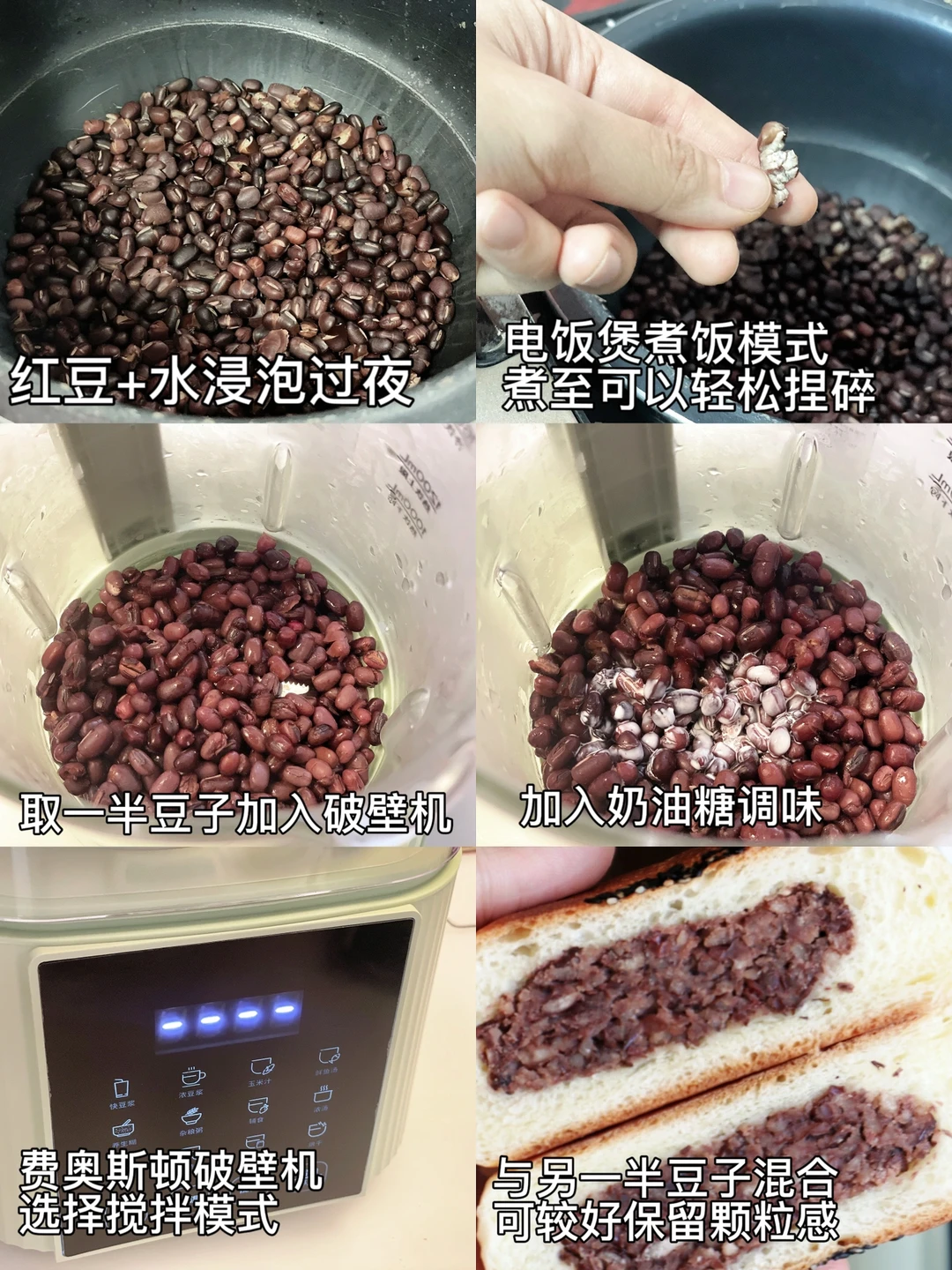 1⃣️提前一宿准备红豆馅料;红豆+水提前浸泡过夜;倒掉泡米水放入配方水电饭煲煮熟,到手指一掐则捏碎的程度;取一半豆子加入淡奶油破壁机打碎,打成豆泥后加入另一半完整豆子放入锅中炒至