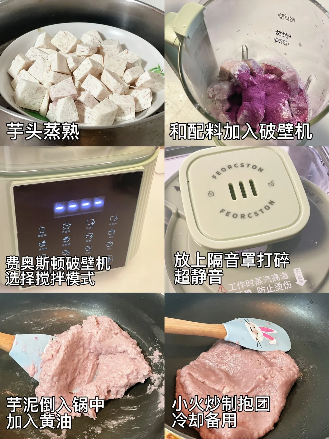 提前准备香芋馅,将芋头蒸熟透,加入材料用破壁机打成泥,放入锅中和黄油一同炒至