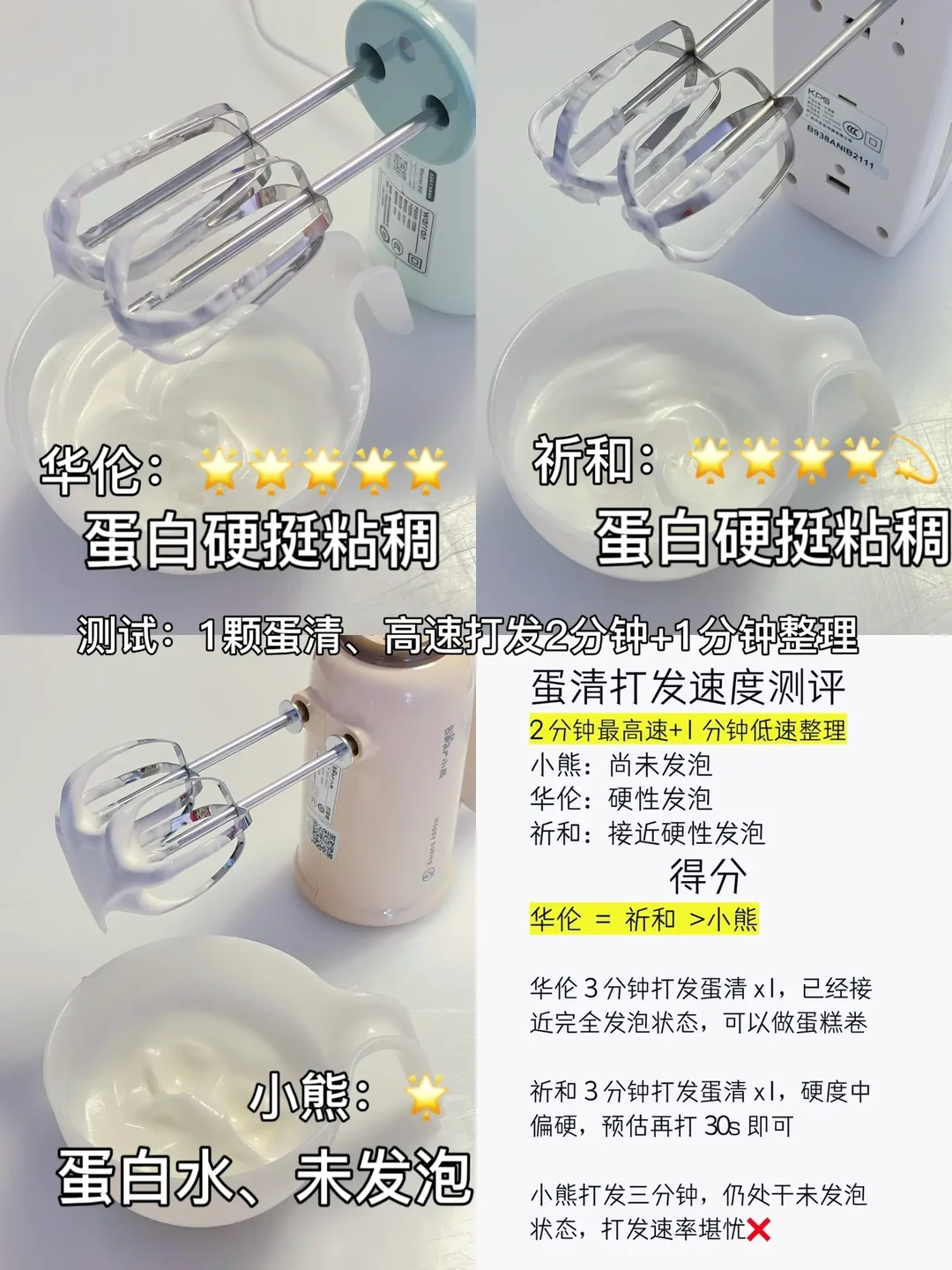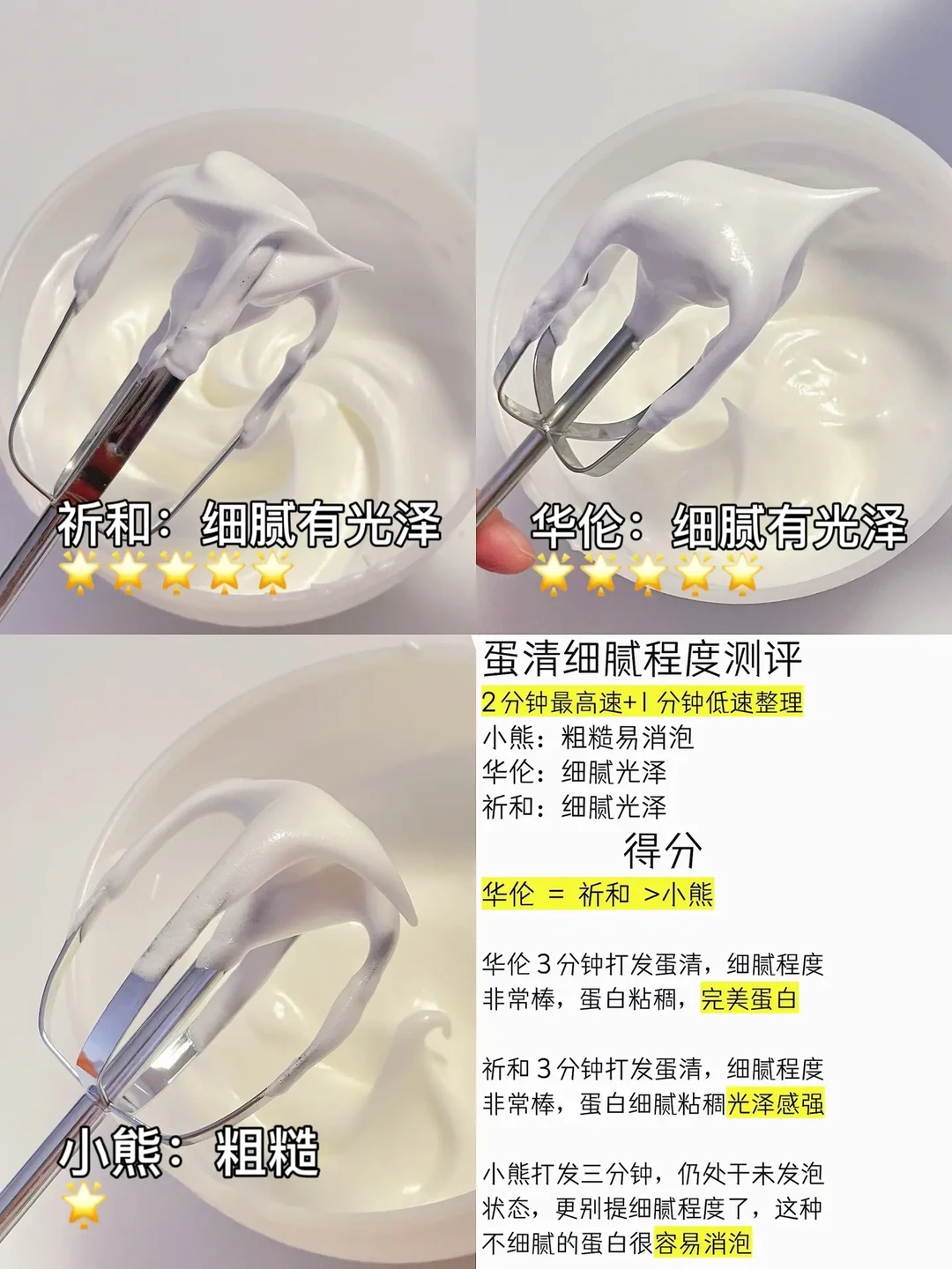 🌟蛋白打发程度:华伦(硬性发泡)>祈和(偏硬性)>小熊(未发泡)