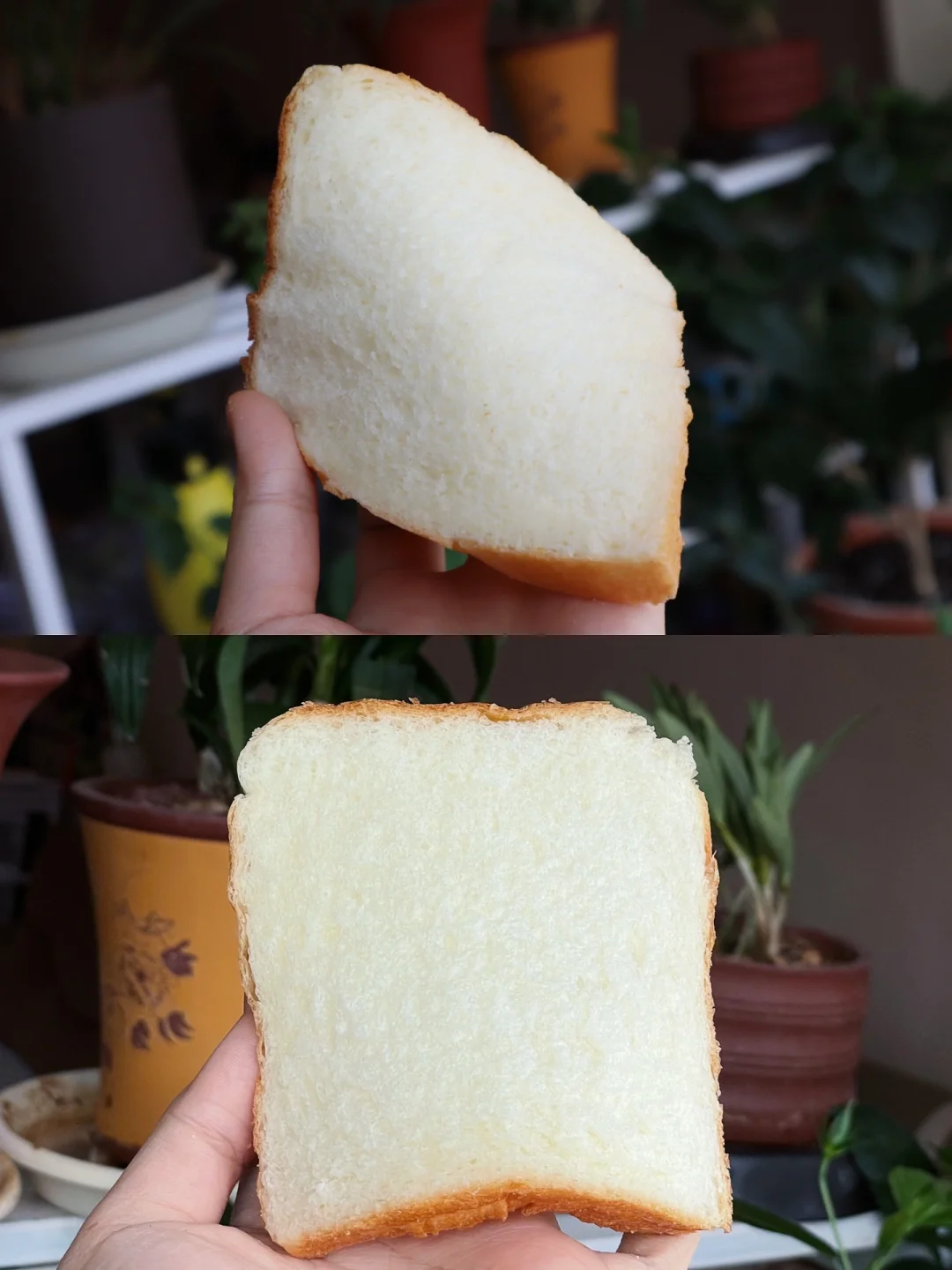 📎这款吐司只需要发到7分满即可加盖烘烤,450g吐司发酵高度应为上端点到盖子距离3cm;出炉即为标准的金顶百边