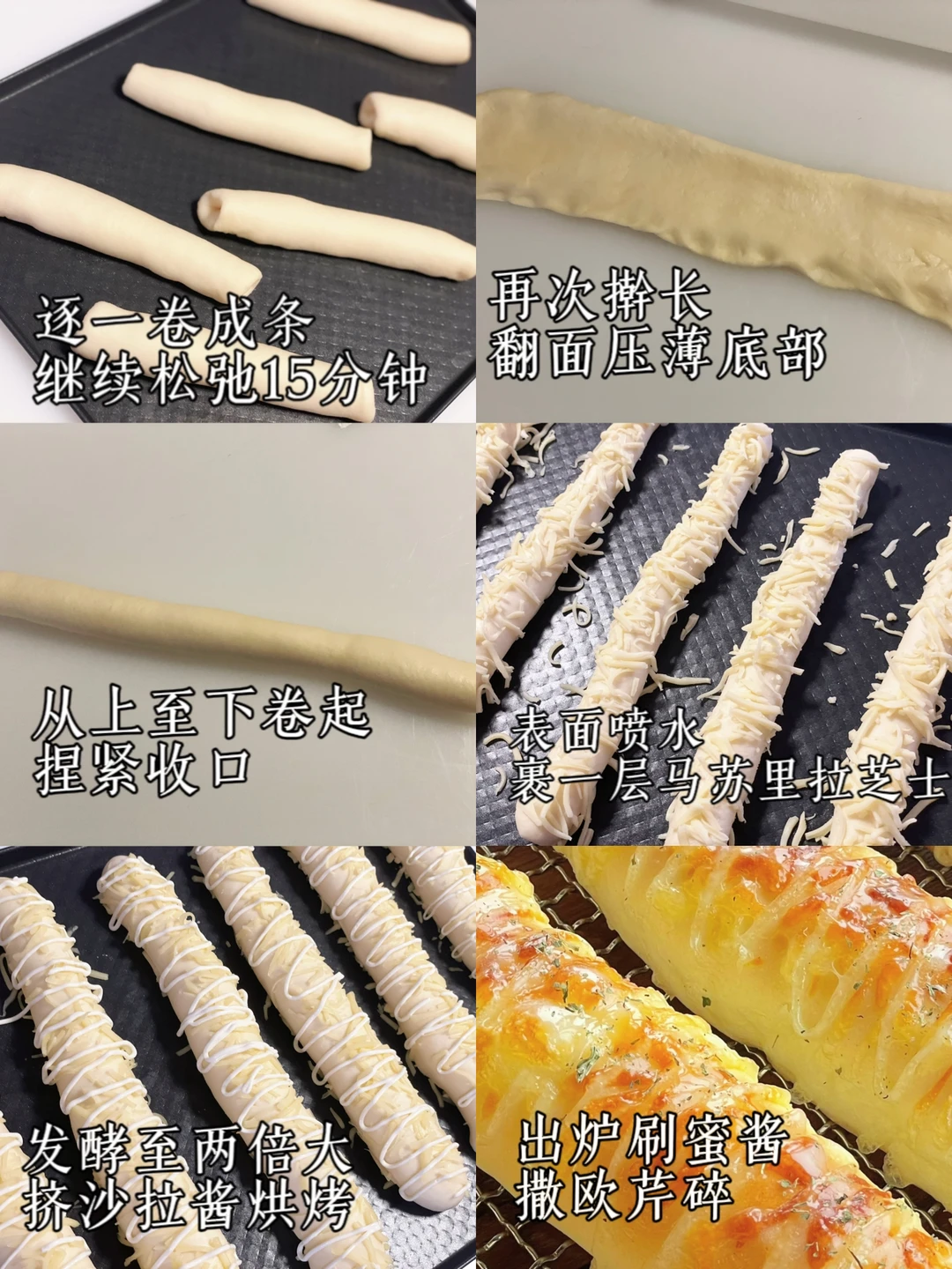 4⃣️擀开,翻面打薄底部卷起;继续松弛15分钟,再次擀长卷起,喷水裹一圈马苏里拉芝士