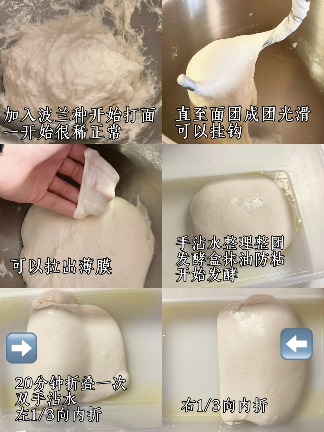 🥣主面团:高筋面粉250g|盐4.5g|水190g|干酵母1g|后加水20g(可不加或少加)|波兰种全部