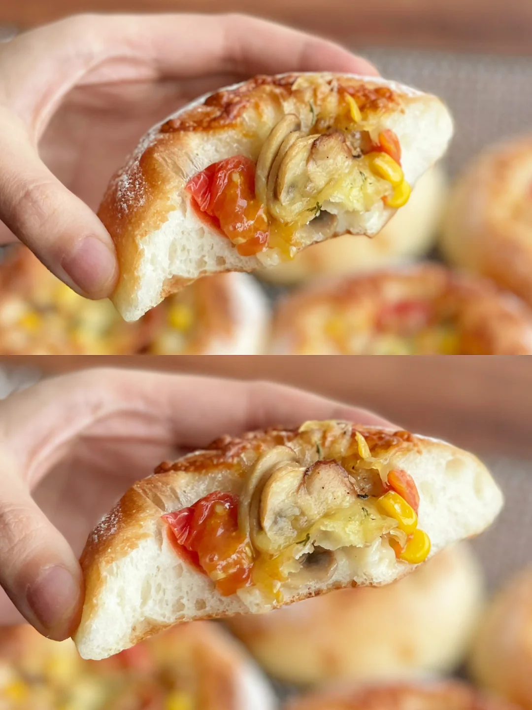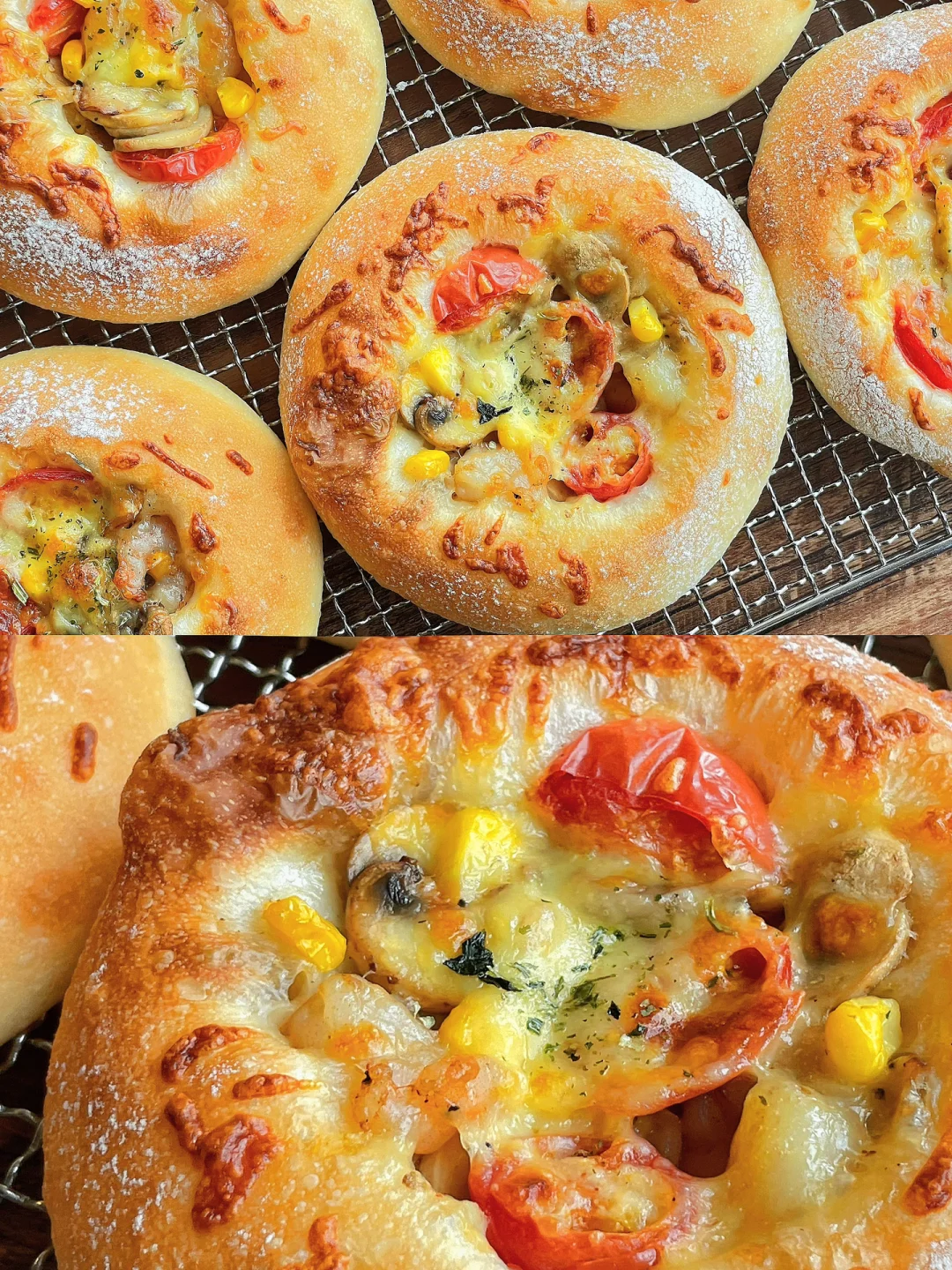 7⃣️继续室温发酵1h左右至体积明显变化;表面撒粉,用手指在中间戳洞,放入配料撒上芝士
