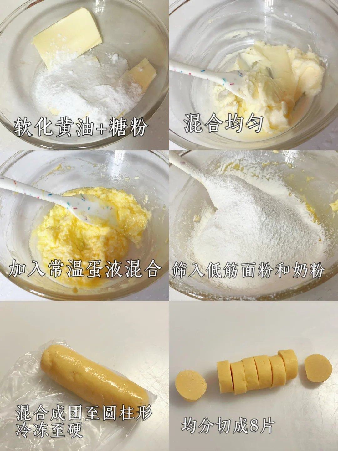 🥣:黄油(软化)45克|常温蛋液20克|糖粉35克|低筋面粉70克|奶粉10克