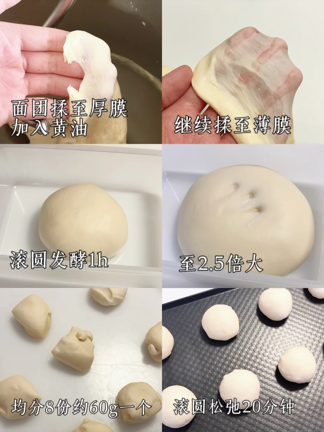 1⃣️将面团所有材料除黄油一同加入搅拌缸打至厚膜状态,加入黄油继续打至完全