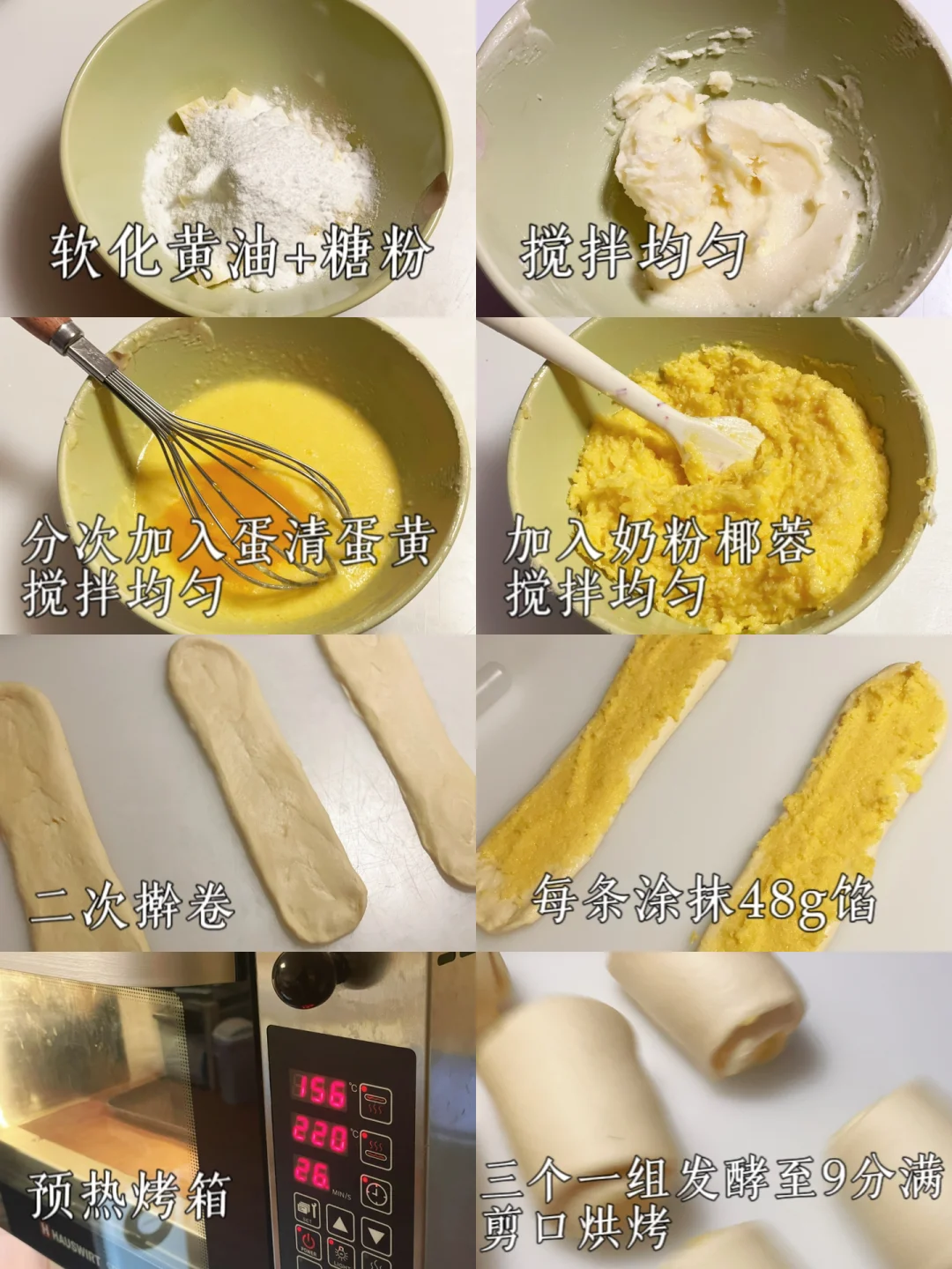 🥣椰蓉馅:黄油50g(可替换椰子油)|糖粉50g|蛋黄50g|蛋白30g|奶粉25g|椰蓉90g