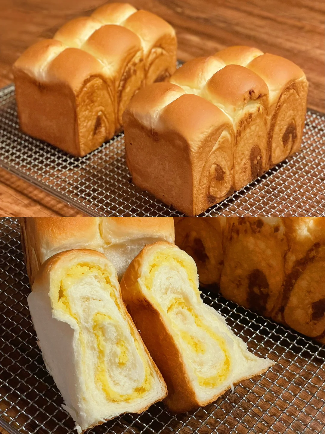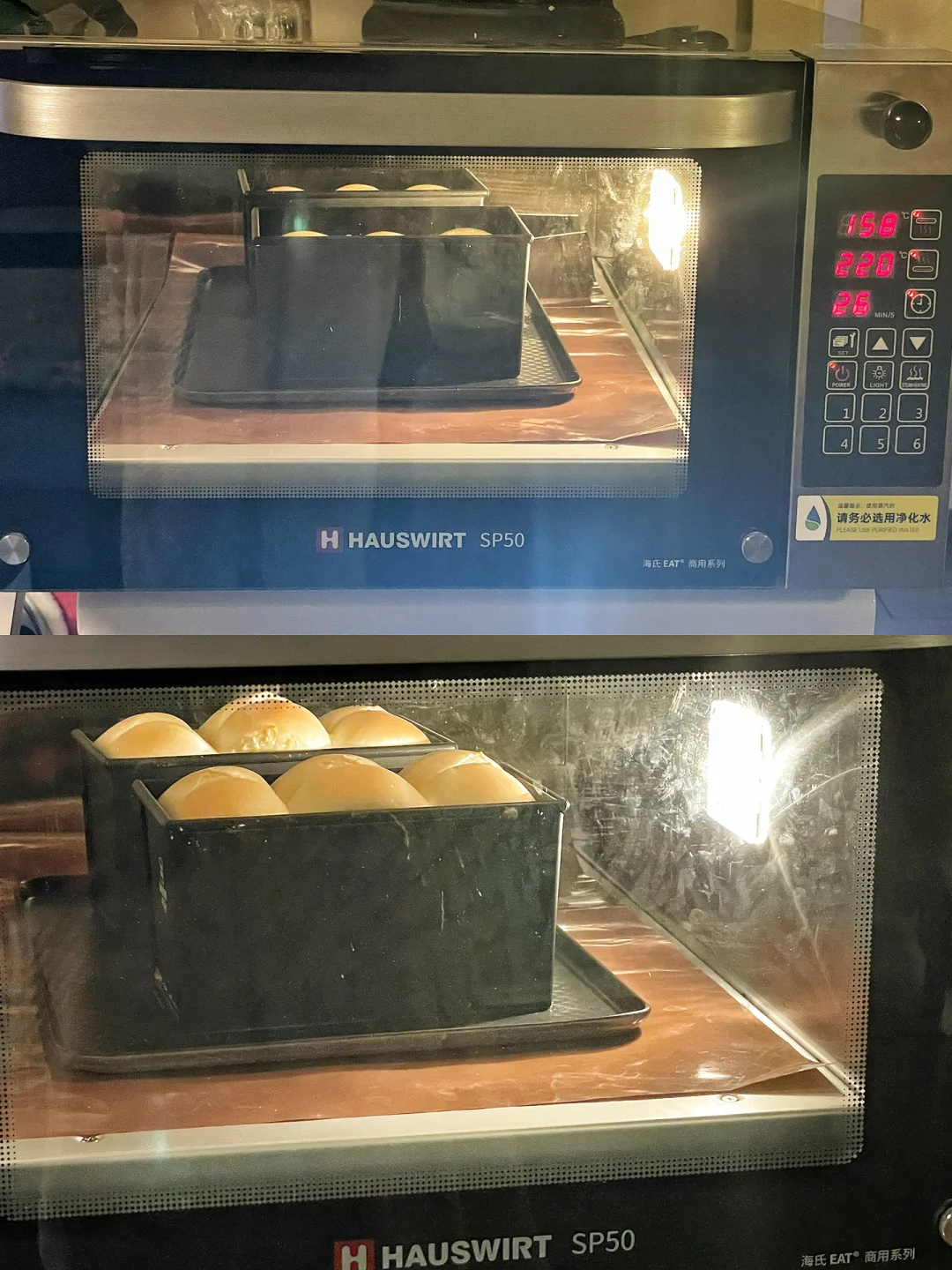 6⃣️表面剪口并在缝隙中挤入软化的黄油帮助裂口;送入上火155/下火210预热好的海氏sp50商用平炉烤箱,低糖盒烘烤26-27分钟/金波盒烘烤33-35分钟