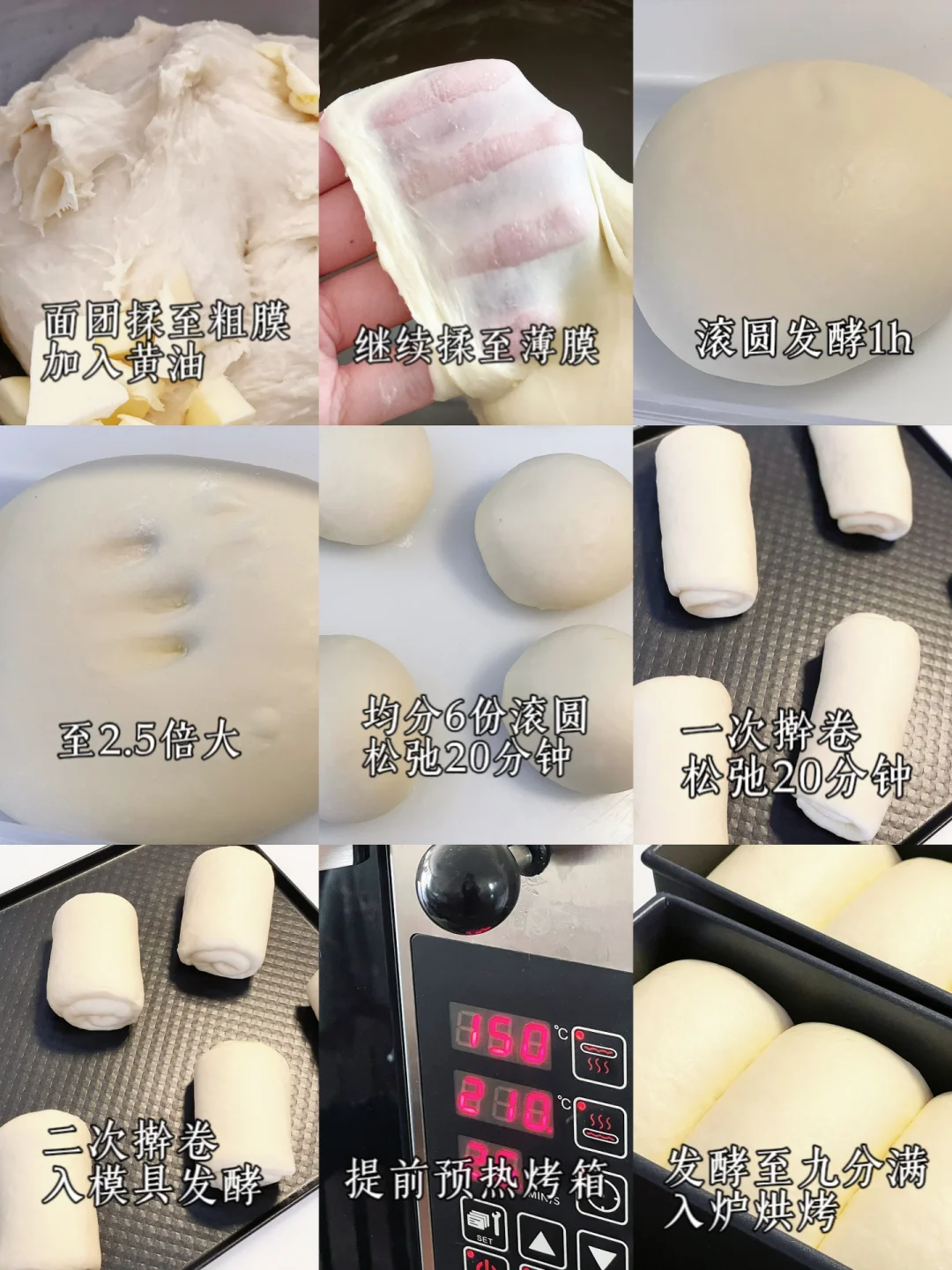 5⃣️一次擀卷,继续松弛20分钟;二次擀卷,3个一组入模,35度/80湿度发酵至9分满