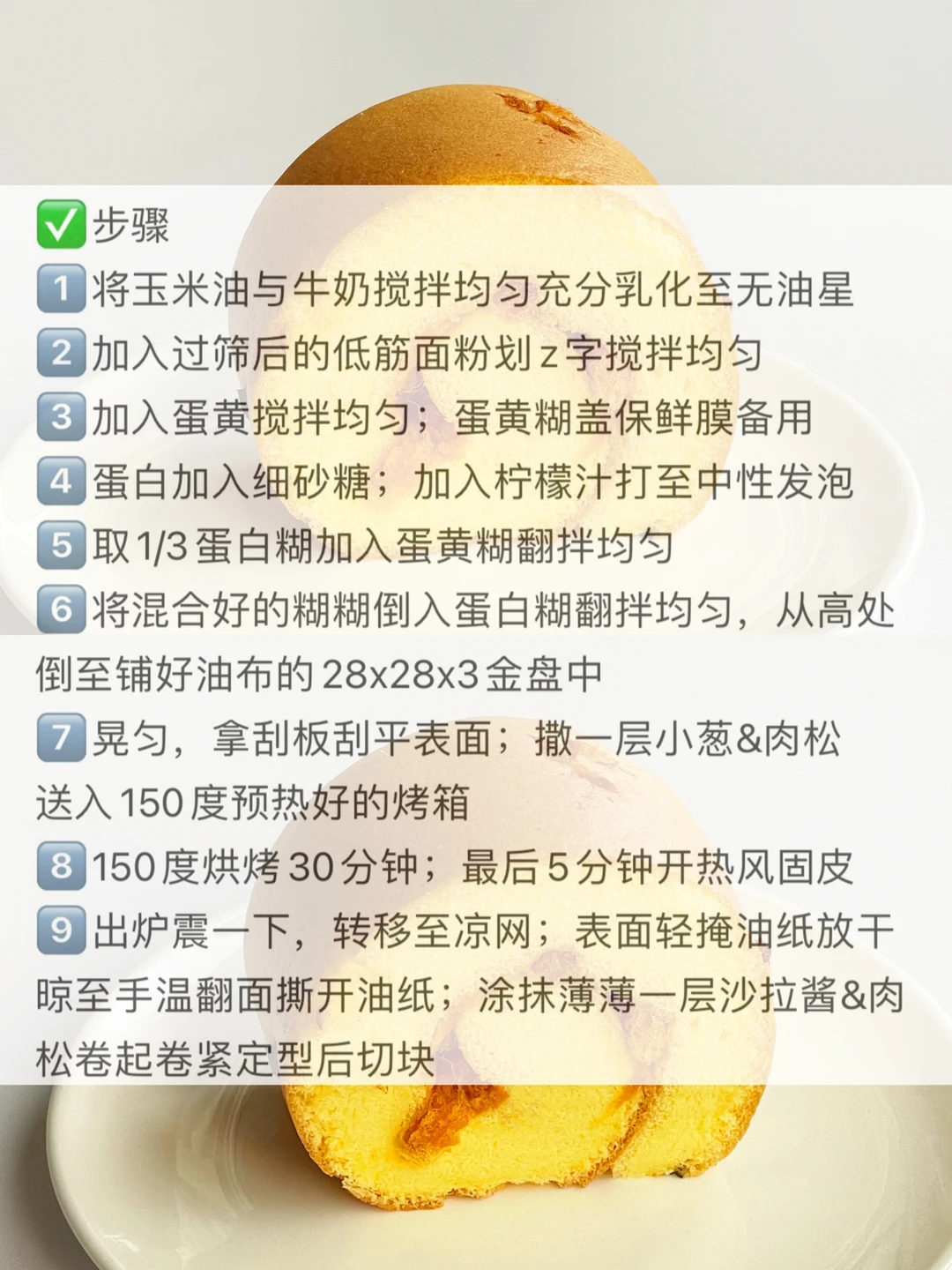 鸡蛋5个(带壳60g左右)|玉米油40g|牛奶60g|低筋面粉65g|细砂糖50g|柠檬汁3g|肉松小葱适量