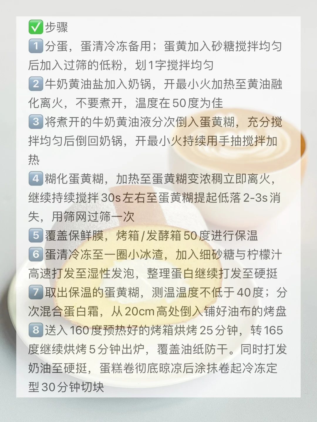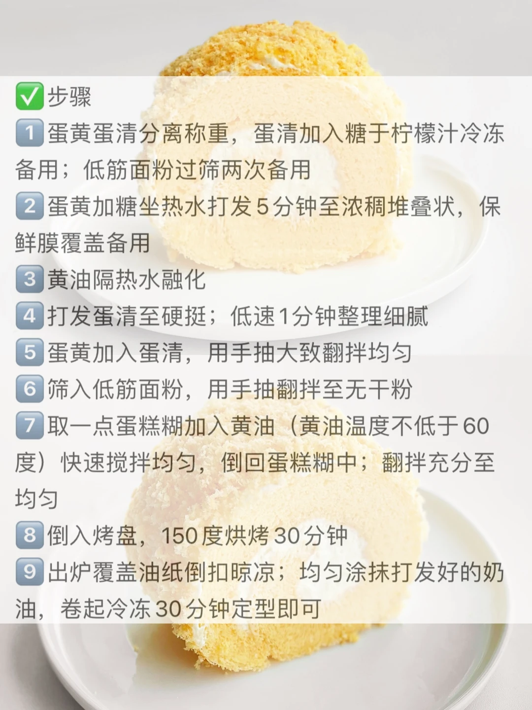 蛋黄糊:牛奶280g|黄油45g|低筋面粉45g|蛋黄86g(约5个)|细砂糖20g|盐2g|蛋清135g(约4个)|细砂糖50g|柠檬汁3g