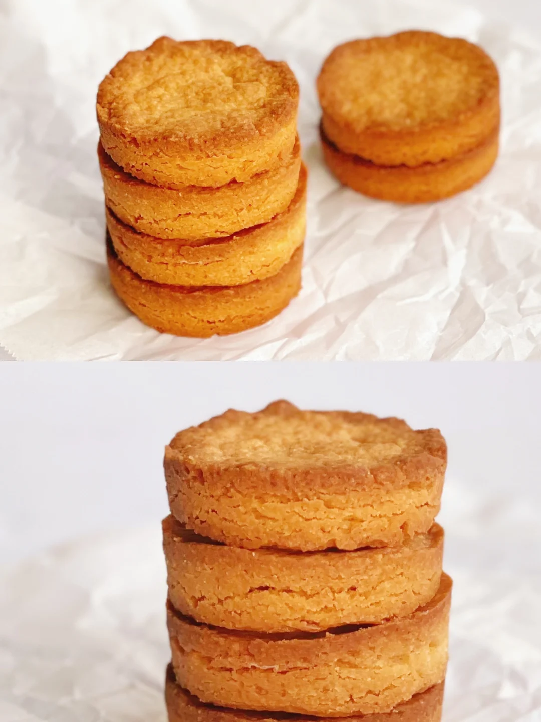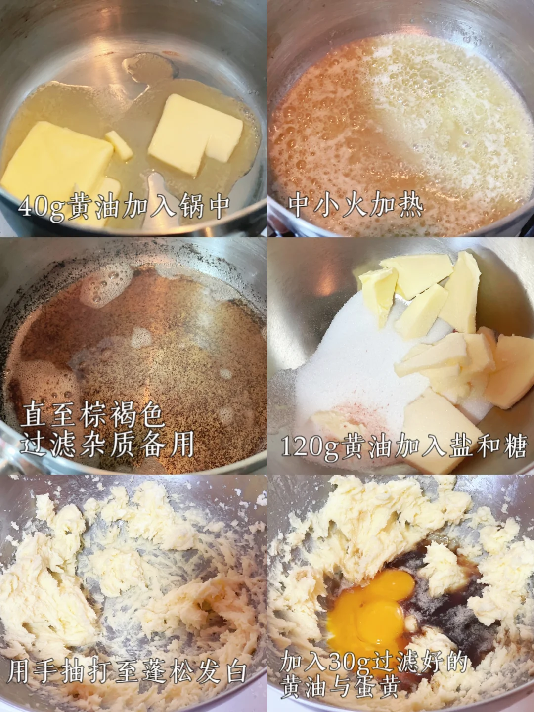 黄油40g(制作成30g焦化黄油)|软化黄油120g|细砂糖75g|常温蛋黄36g|海盐2g|低筋面粉130g|杏仁粉40g