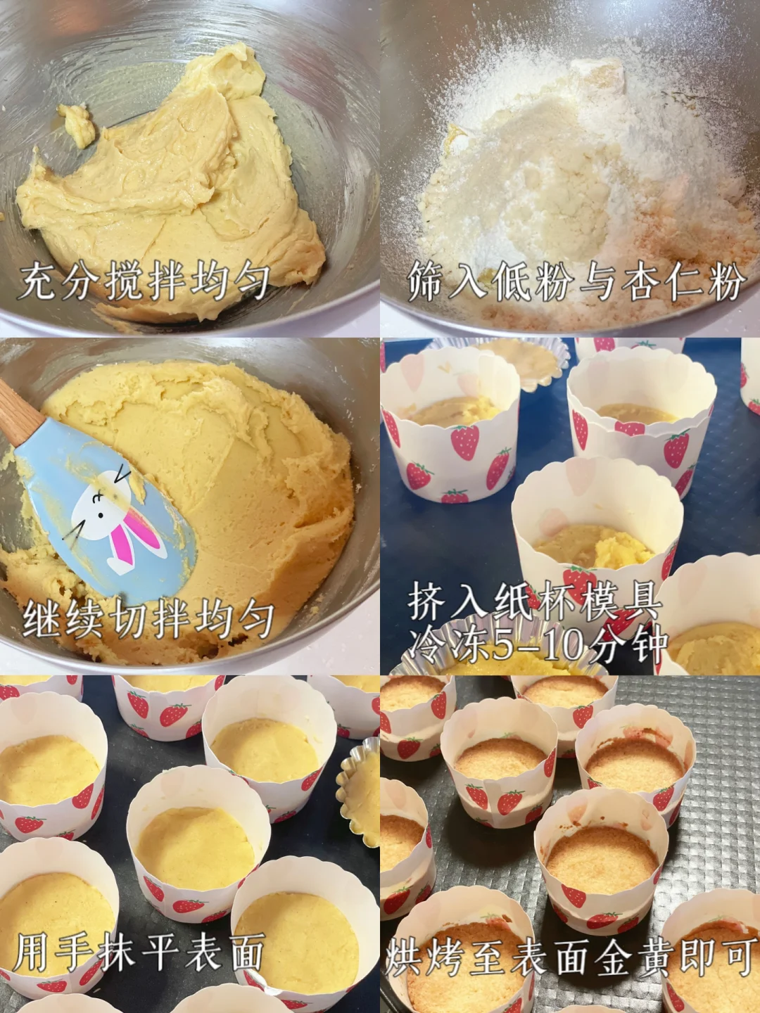 4⃣️过筛加入低筋面粉与杏仁粉,切拌均匀装入裱花袋备用;面糊应为较软挤出顺滑
