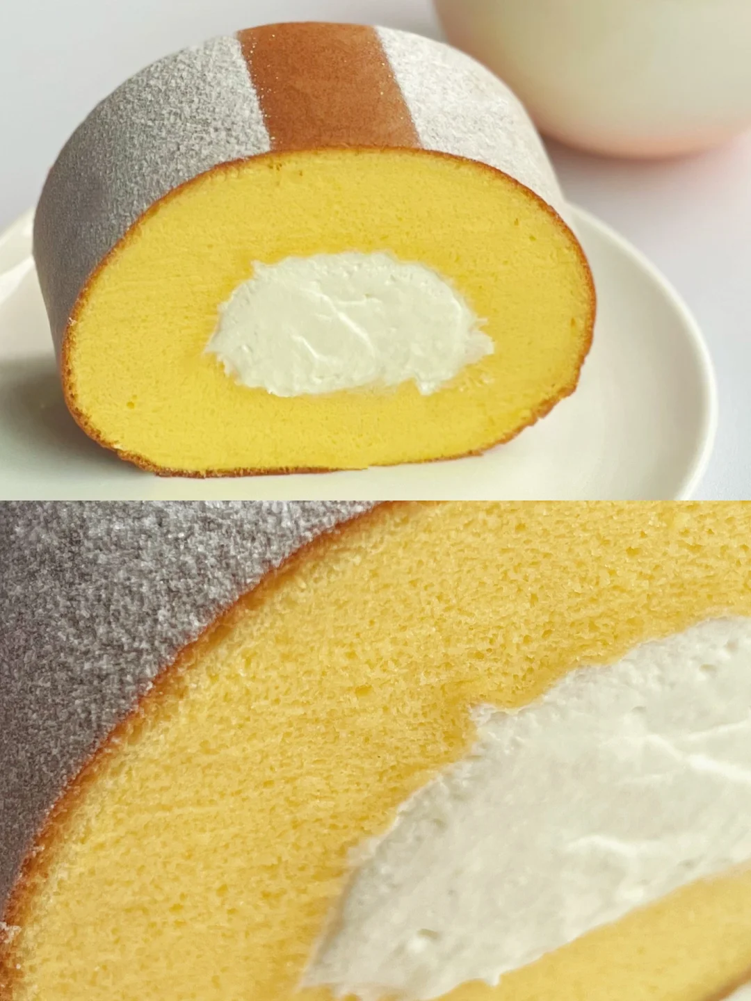 8⃣️送入160度预热好的烤箱烘烤25分钟,转165度继续烘烤5分钟出炉,覆盖油纸防干。同时打发奶油至硬挺,蛋糕卷彻底晾凉后涂抹卷起冷冻定型30分钟切块