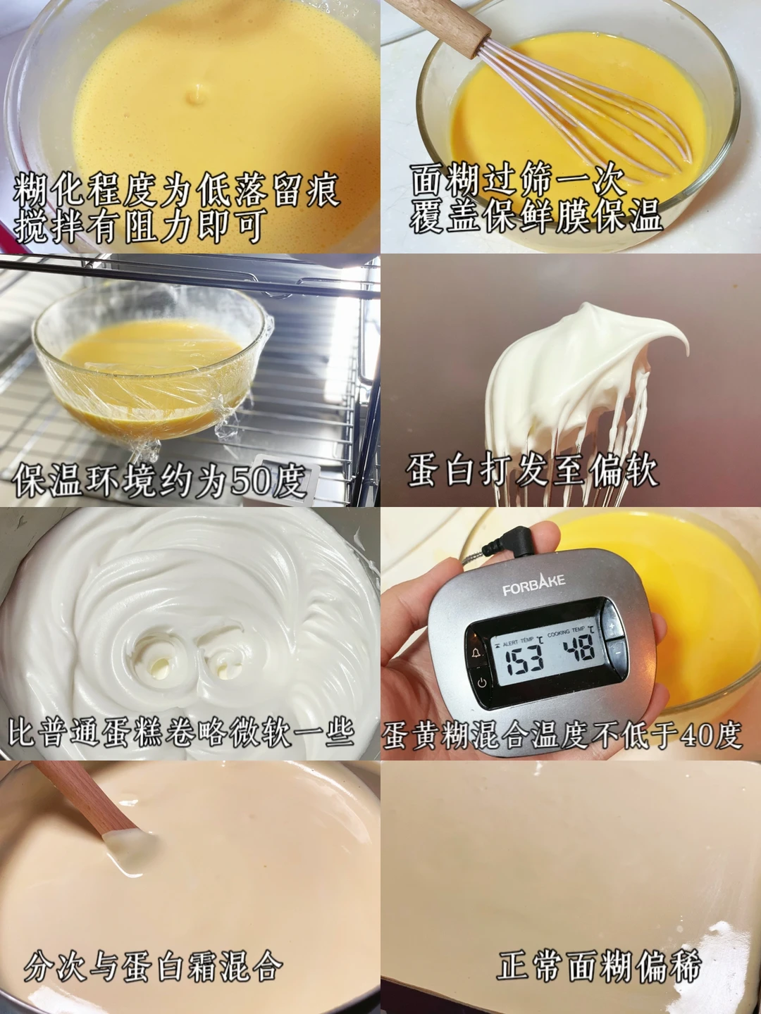 📎蛋黄糊保温温度设定在50-60度,最终混合时蛋黄糊温度不要低于40否则容易消泡,没有两台烤箱/发酵箱进行保温的可以坐热水进行保温
