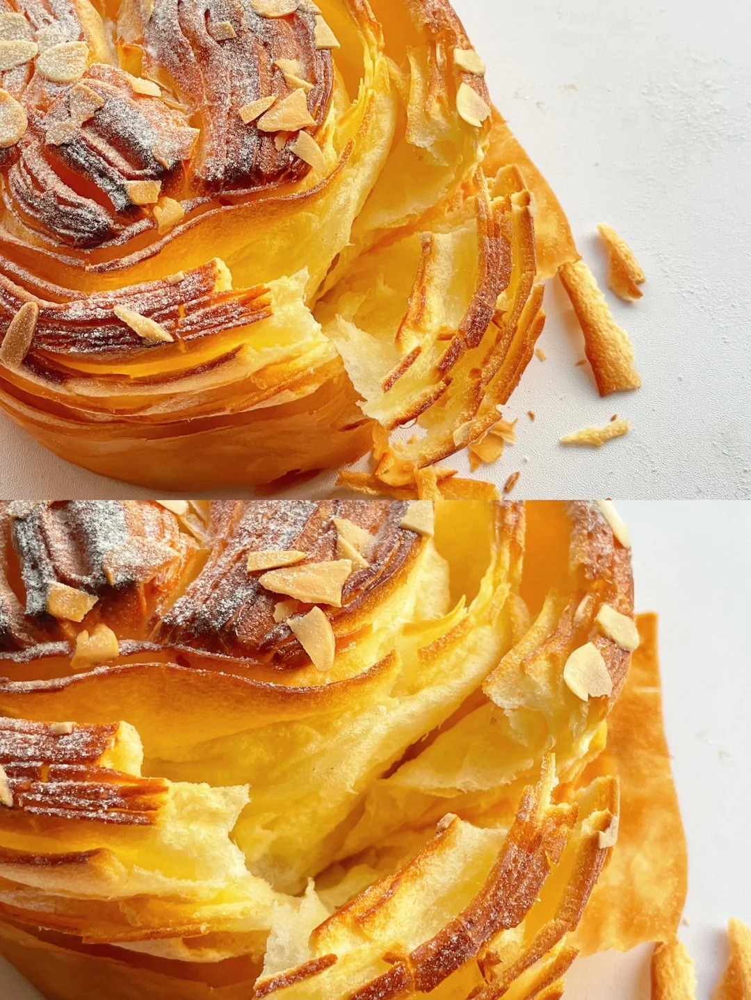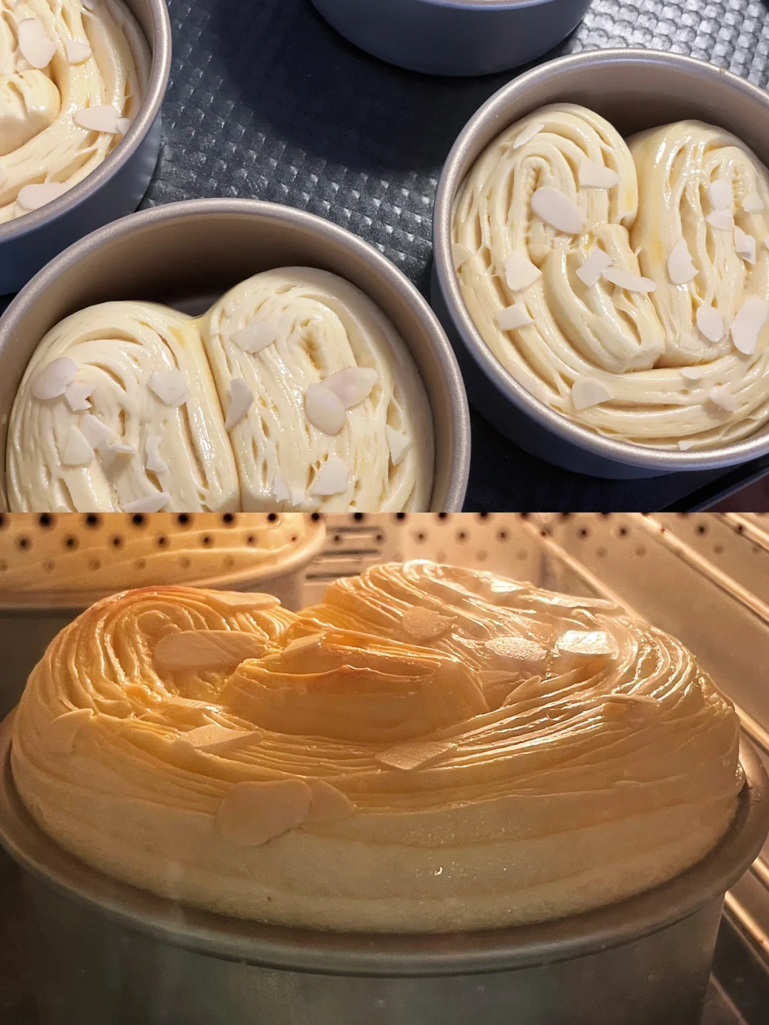 1⃣️1⃣️放入28-30度发酵箱发至层次炸开,刷蛋液与杏仁片装饰