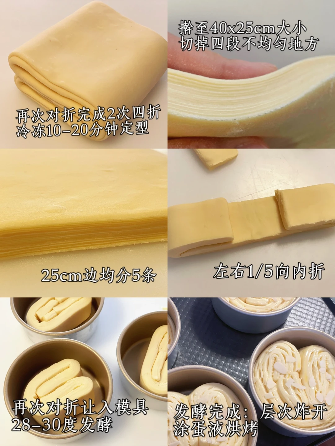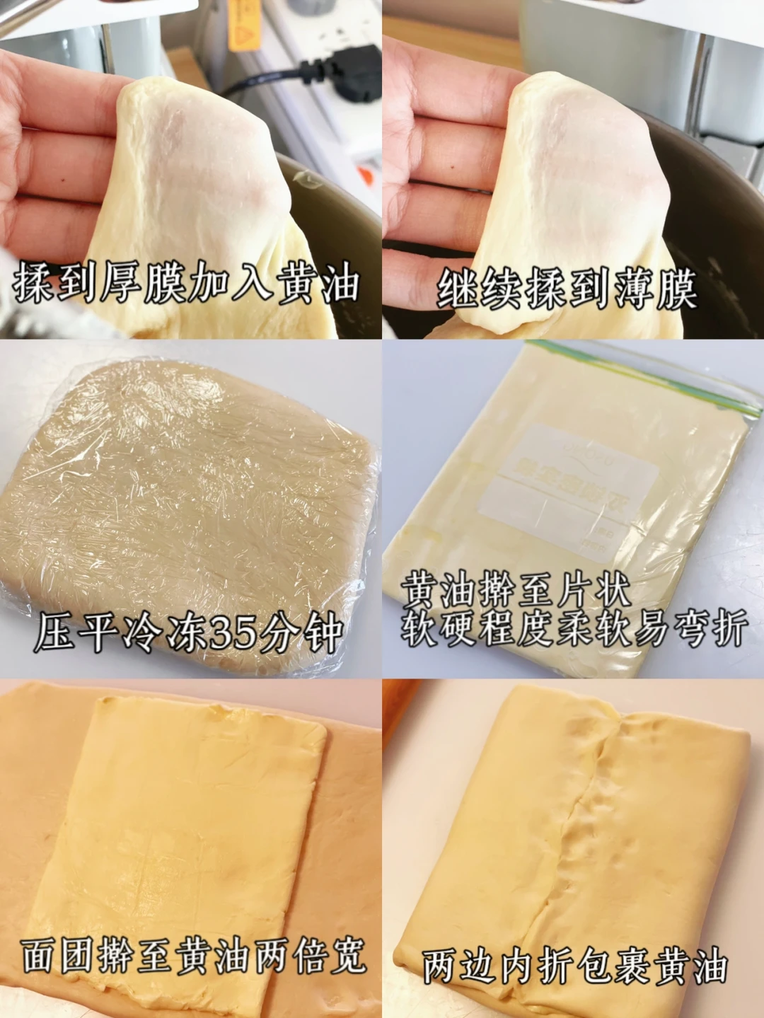 📎黄油片的软硬程度要把握好,不能过硬否则会造成断油层次不佳,黄油遇到过硬的面团会变得更硬,太软则容易混酥