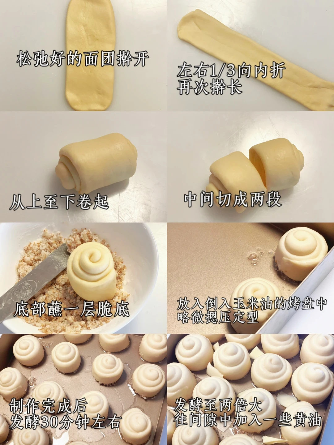 6⃣️底部粘一层脆底,略微摁扁定型;放入倒入玉米油的烤盘,35度/80湿度发酵30分钟左右至两倍大