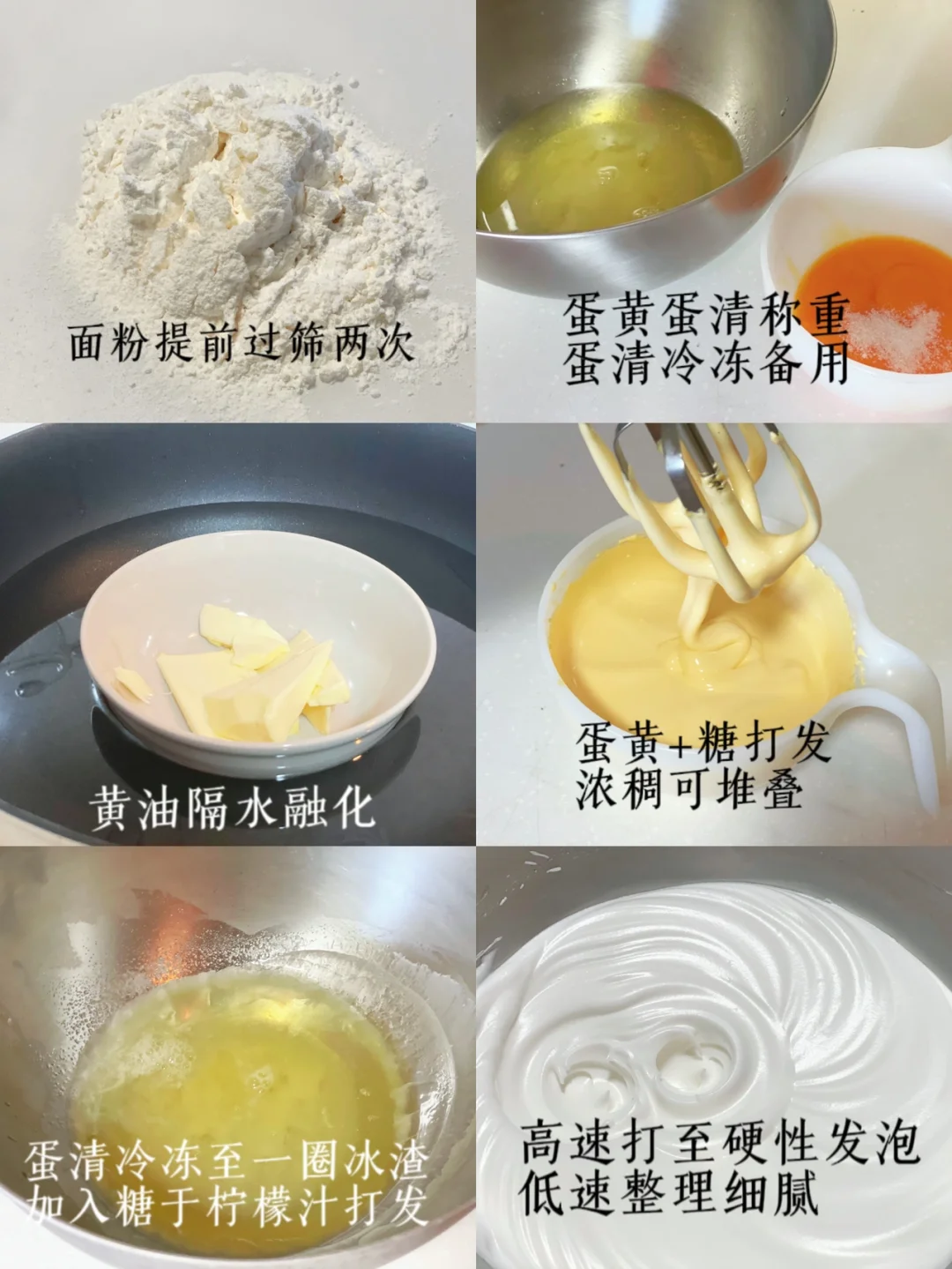 1⃣️蛋黄蛋清分离称重,蛋清加入糖于柠檬汁冷冻备用;低筋面粉过筛两次备用