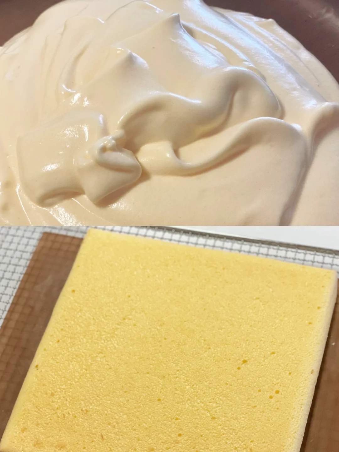 9⃣️出炉覆盖油纸倒扣晾凉;均匀涂抹打发好的奶油,卷起冷冻30分钟定型即可
