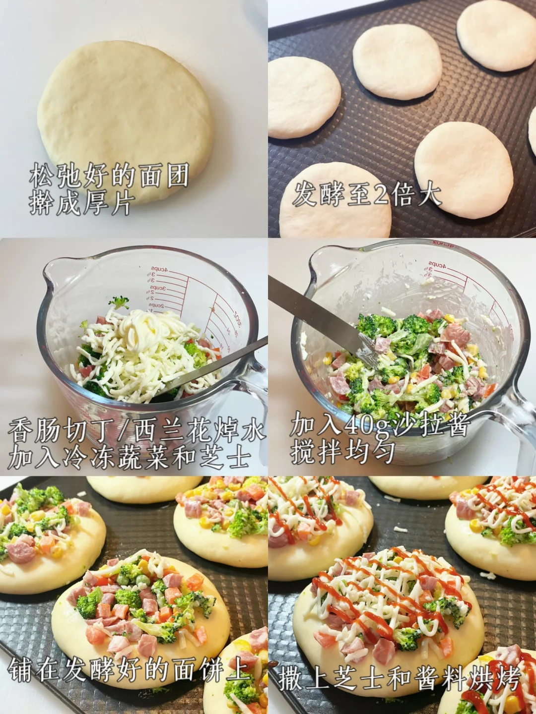 5⃣️发酵间隙制作馅料;西兰花焯水香肠切丁;冷冻蔬菜解冻吸干水分,加入马苏里拉芝士和沙拉酱混合均匀