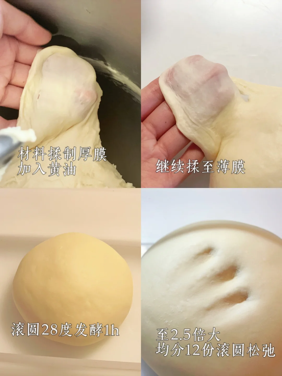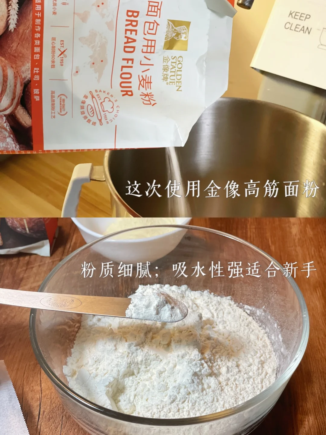 面团🥣:金像高筋面粉500g|盐6g|糖60g|奶粉20g|耐高糖干酵母5g|全蛋液50g|牛奶330g|黄油40g