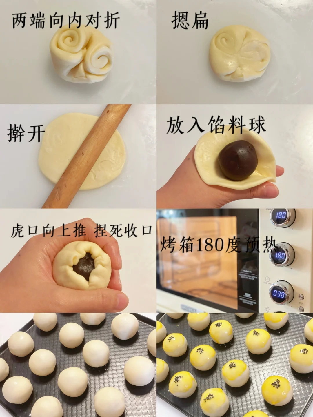 7⃣️松弛15分钟;中间拇指摁一下;两头对折再压扁;上下左右各擀一次;呈圆形。放入豆沙蛋黄馅,用虎口往上推收口,收口捏成揪揪,防爆口。