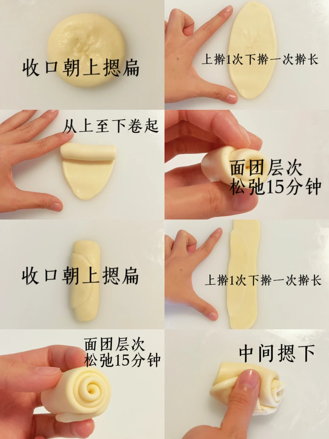5⃣️松弛15分钟;收口朝上略微拍扁,擀面杖上擀一次下擀一次,请勿来回擀,卷起