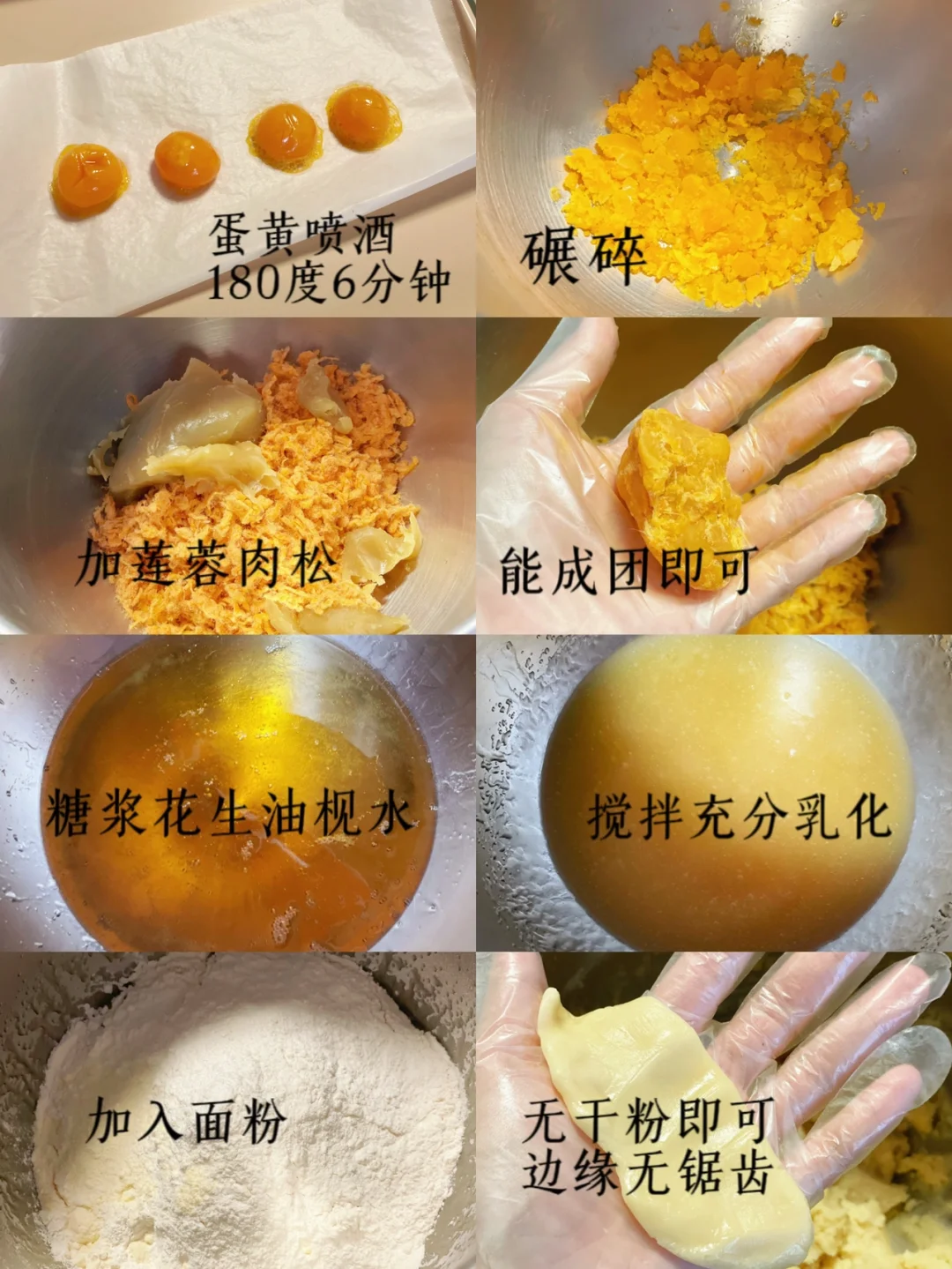 彻底解冻的蛋黄喷白酒,180烘烤8分钟;碾碎加入肉松白莲蓉,混合均匀能成团即可