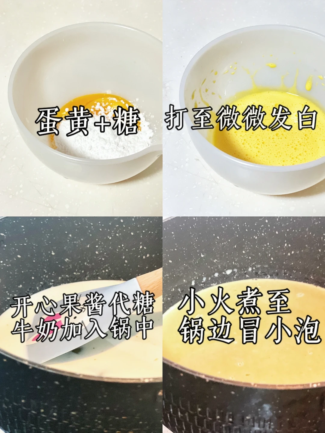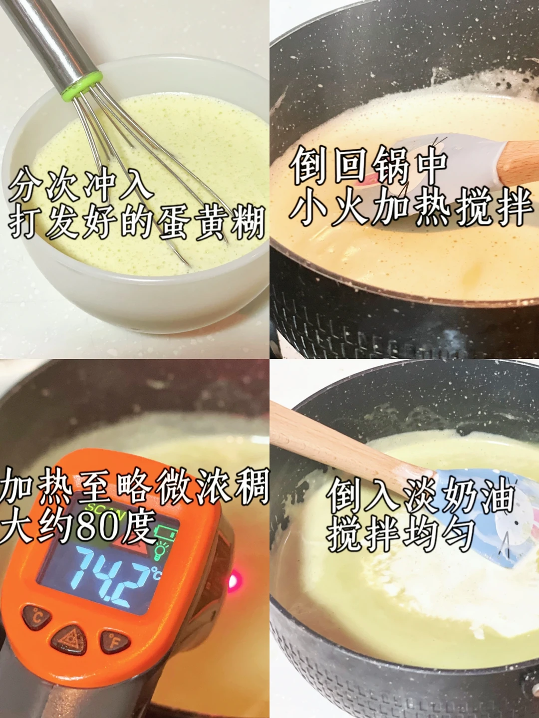4⃣️再次倒回锅中,小火加热煮至80度左右略微浓稠