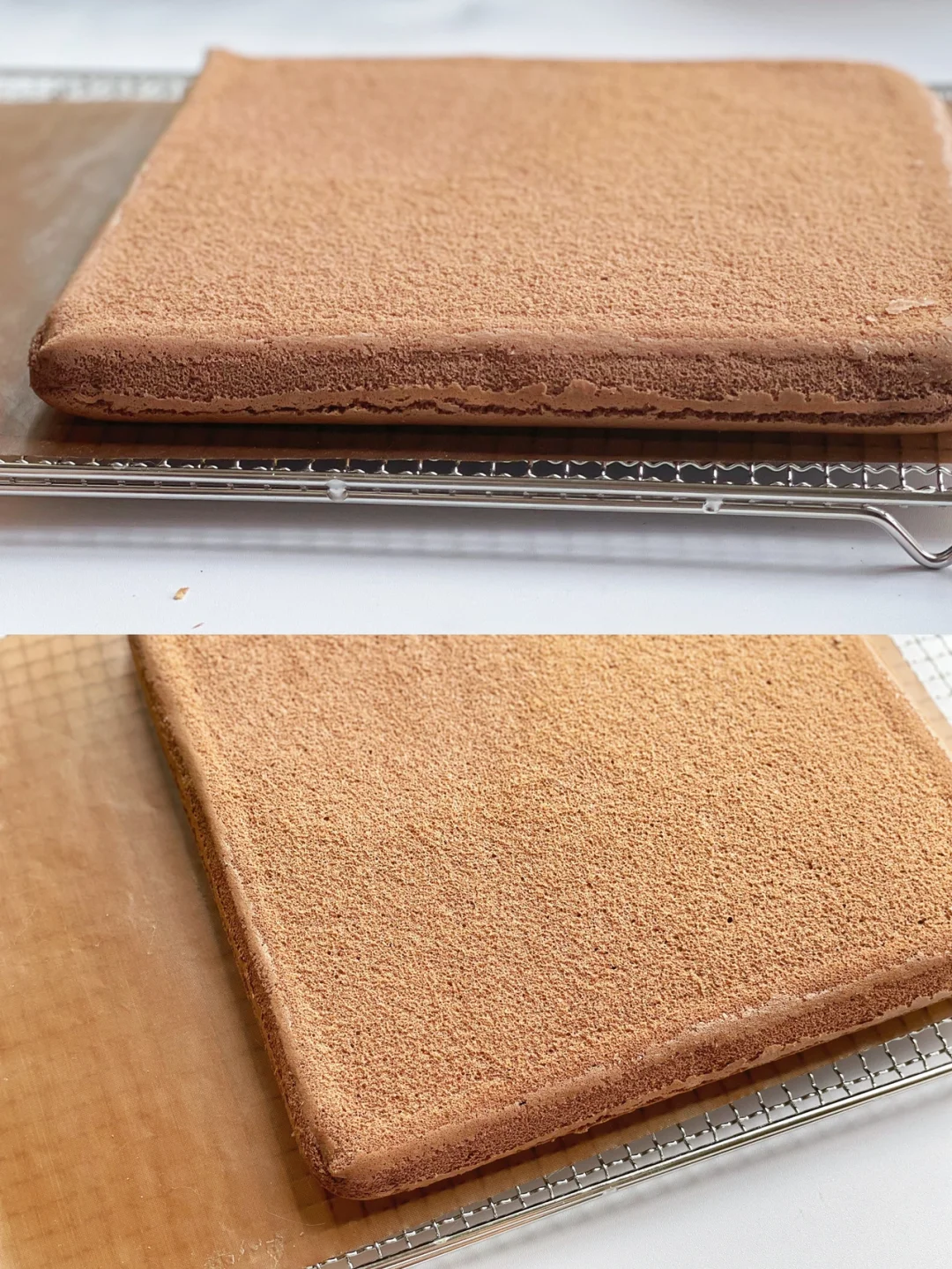 7⃣️出炉震盘,表面粘油布倒扣,晾凉撕下油纸打发奶油