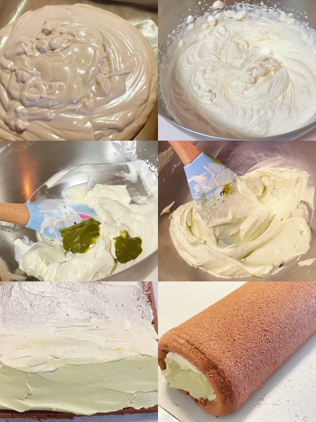 8⃣️奶油打发至硬挺状;取出1/2加入抹茶酱和抹茶粉搅拌均匀。涂抹奶油卷起冷冻30分钟定型