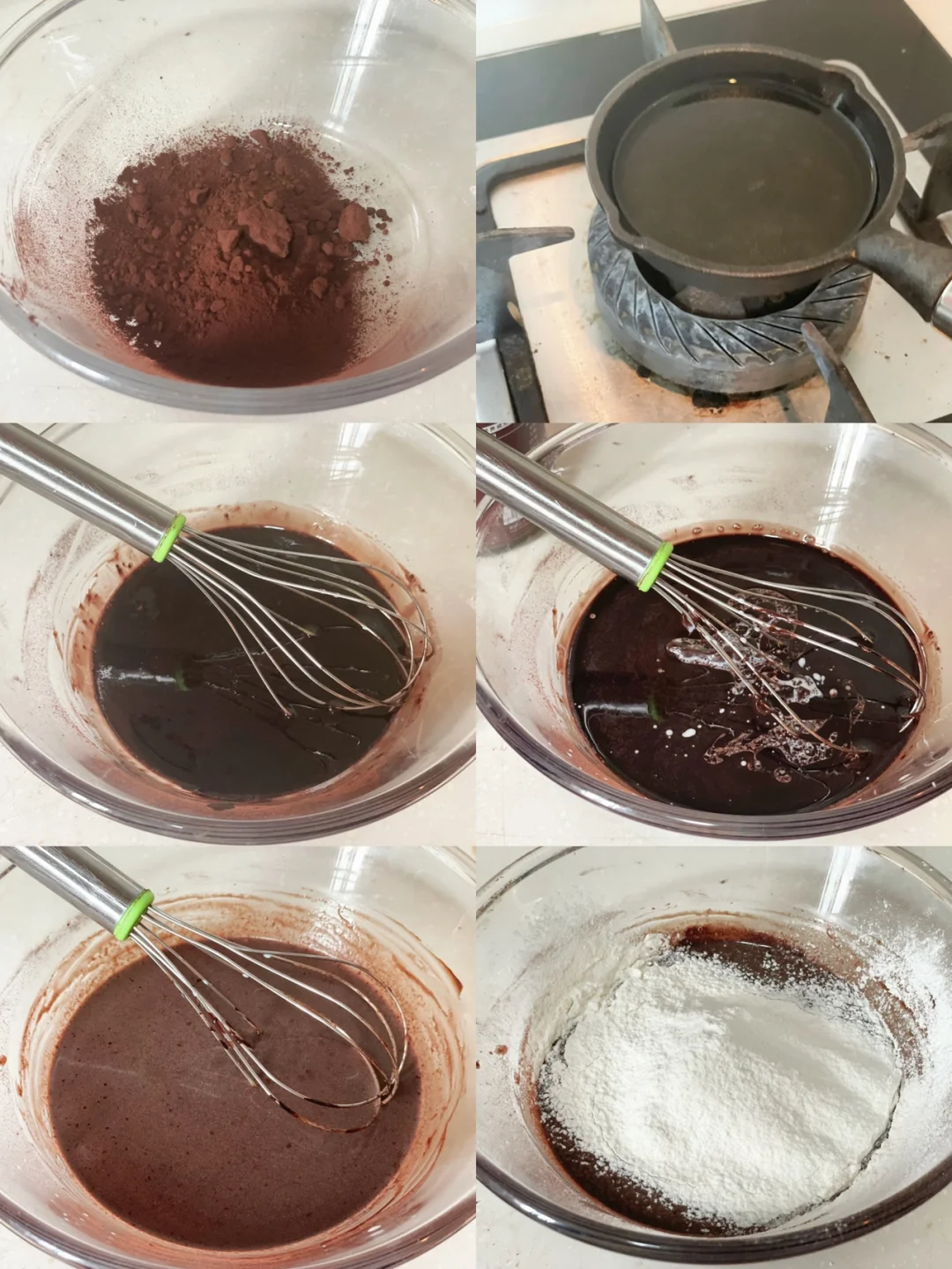 2⃣️将玉米油倒入小锅,最小火加热至40-50度之间,冲入可可粉搅拌均匀