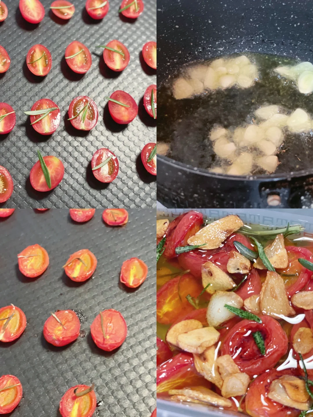 1⃣️提前制作油浸小番茄,小番茄洗净对半切开,上面铺一些迷迭香调味;150度烘烤1h左右烤干。