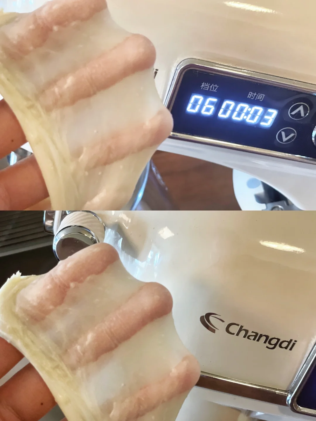 4⃣️水解后加入波兰种酵母与盐,打至薄膜后加入橄榄油低速搅拌均匀
