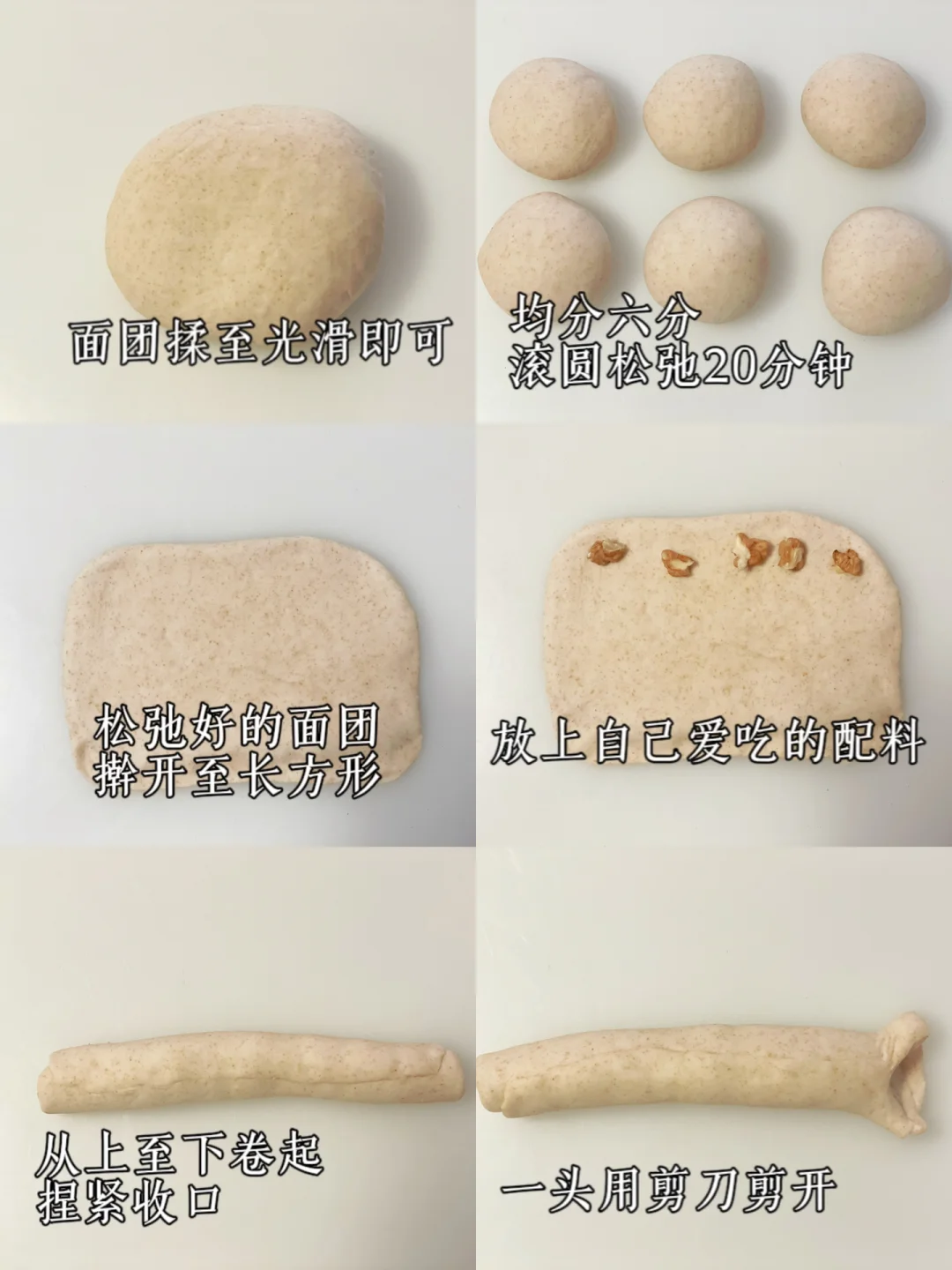 📎面团光滑即可但也需要一定筋度,手揉也很快~烘烤过程中底部炸开则是制作时未捏紧收口,侧面撕裂状则是卷太紧松弛不够/筋度太弱