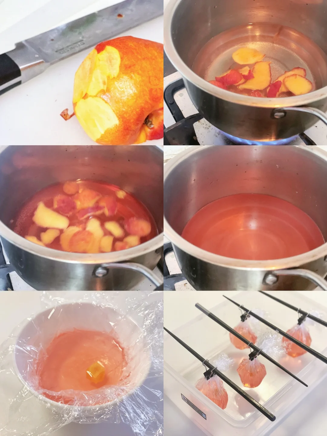 2⃣️将水,糖,与桃子皮加入锅中;小火煮开至水变成粉色