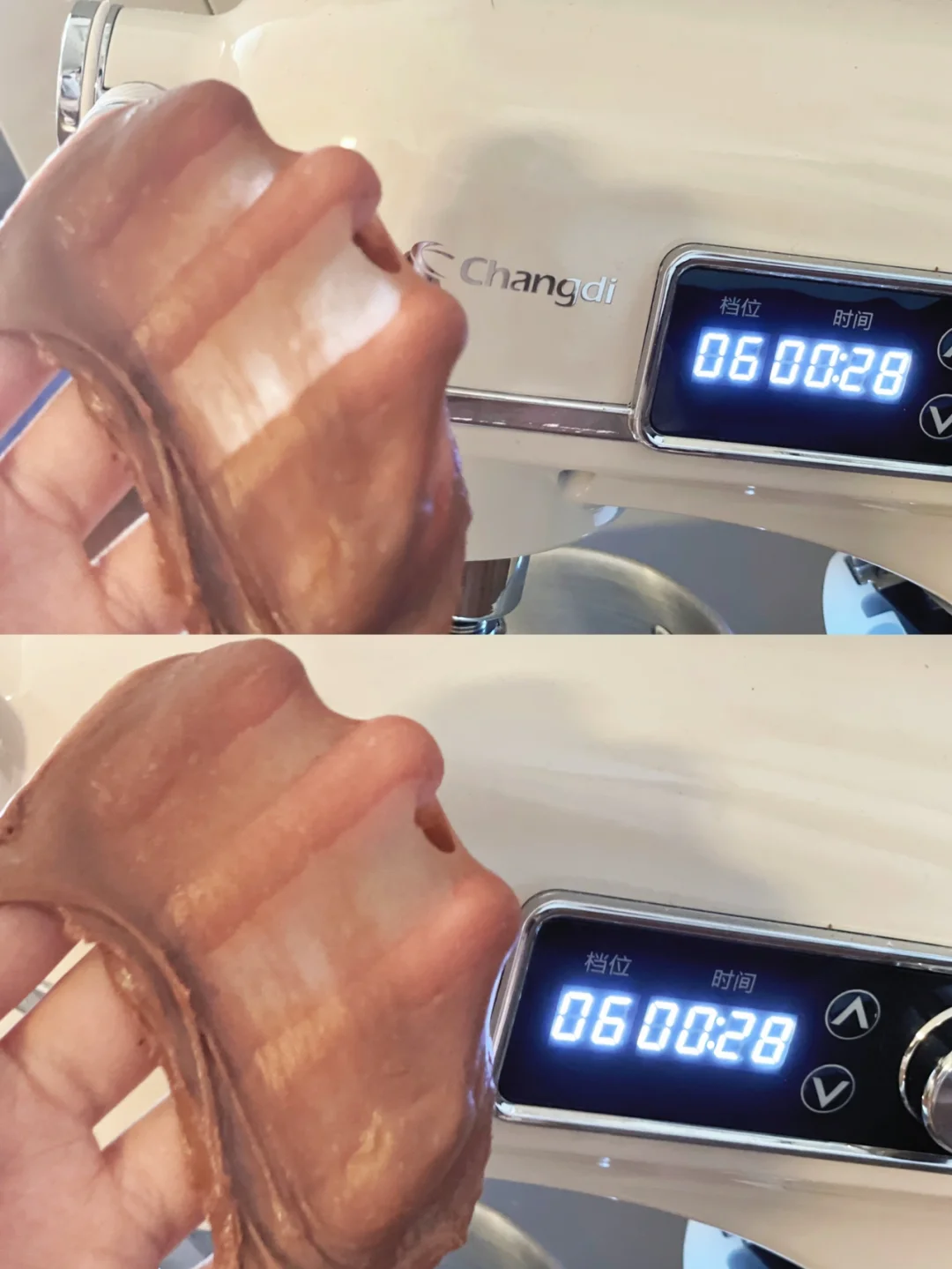6档2分钟左右揉至完全阶段,1档1分钟混合可可豆