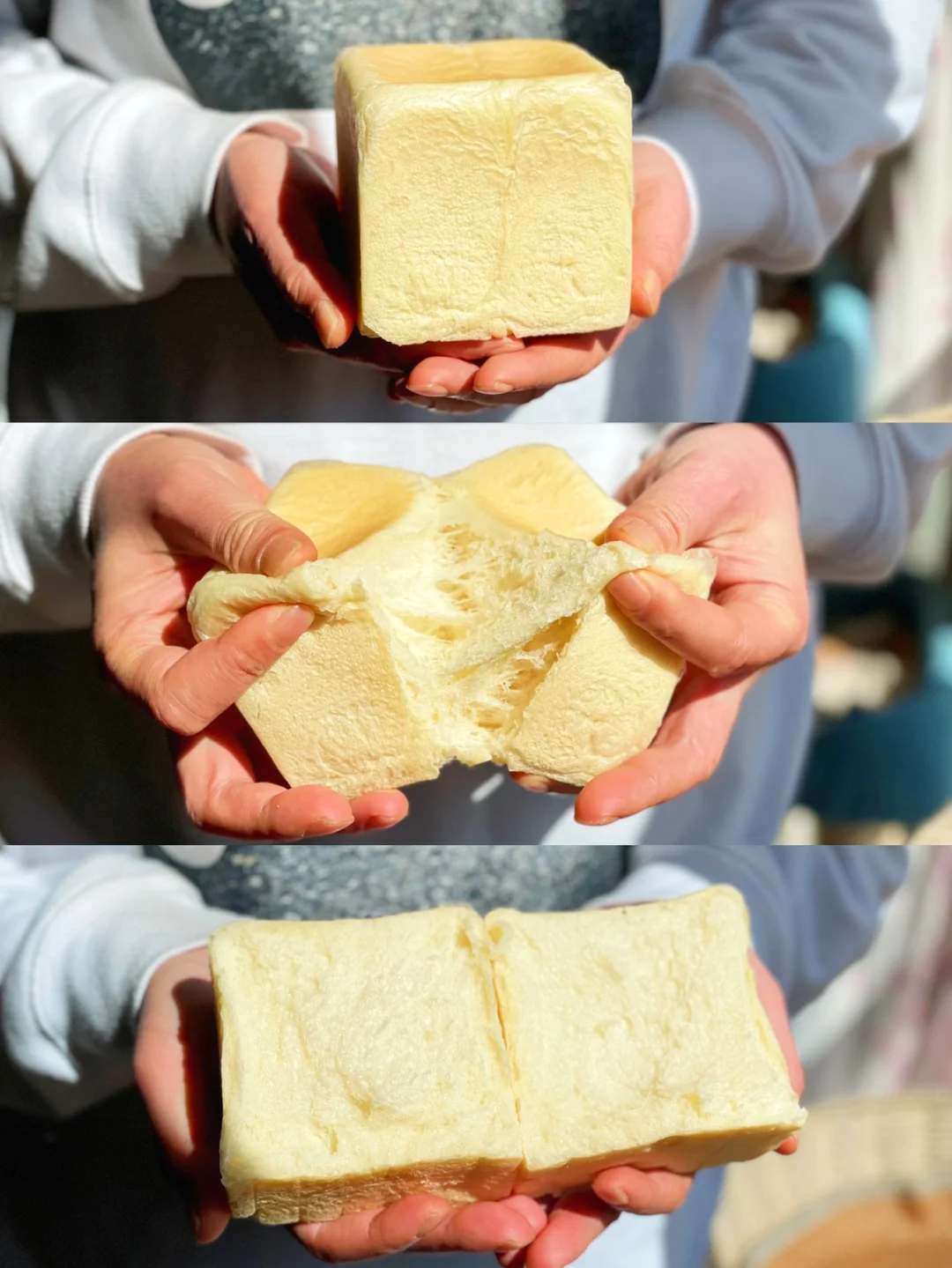 🤍吐司口感真的神奇妙,Q弹~与众不同的,大家请一定要试一试呀!切开组织如丝光棉般闪闪发光,柔软细腻!ps:对🍞小白不是很友好!