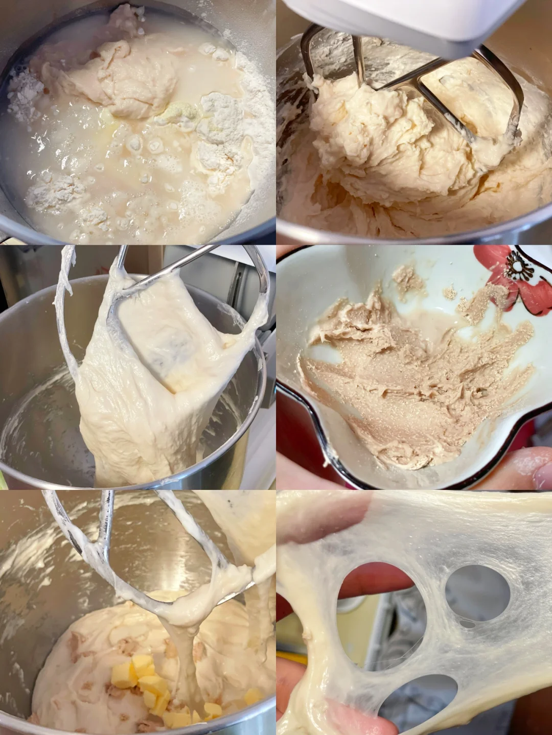 📎面团含水量非常大,前期请使用k浆,成团后换回打面勾。天气热请严格注意控温,也可以后放酵母