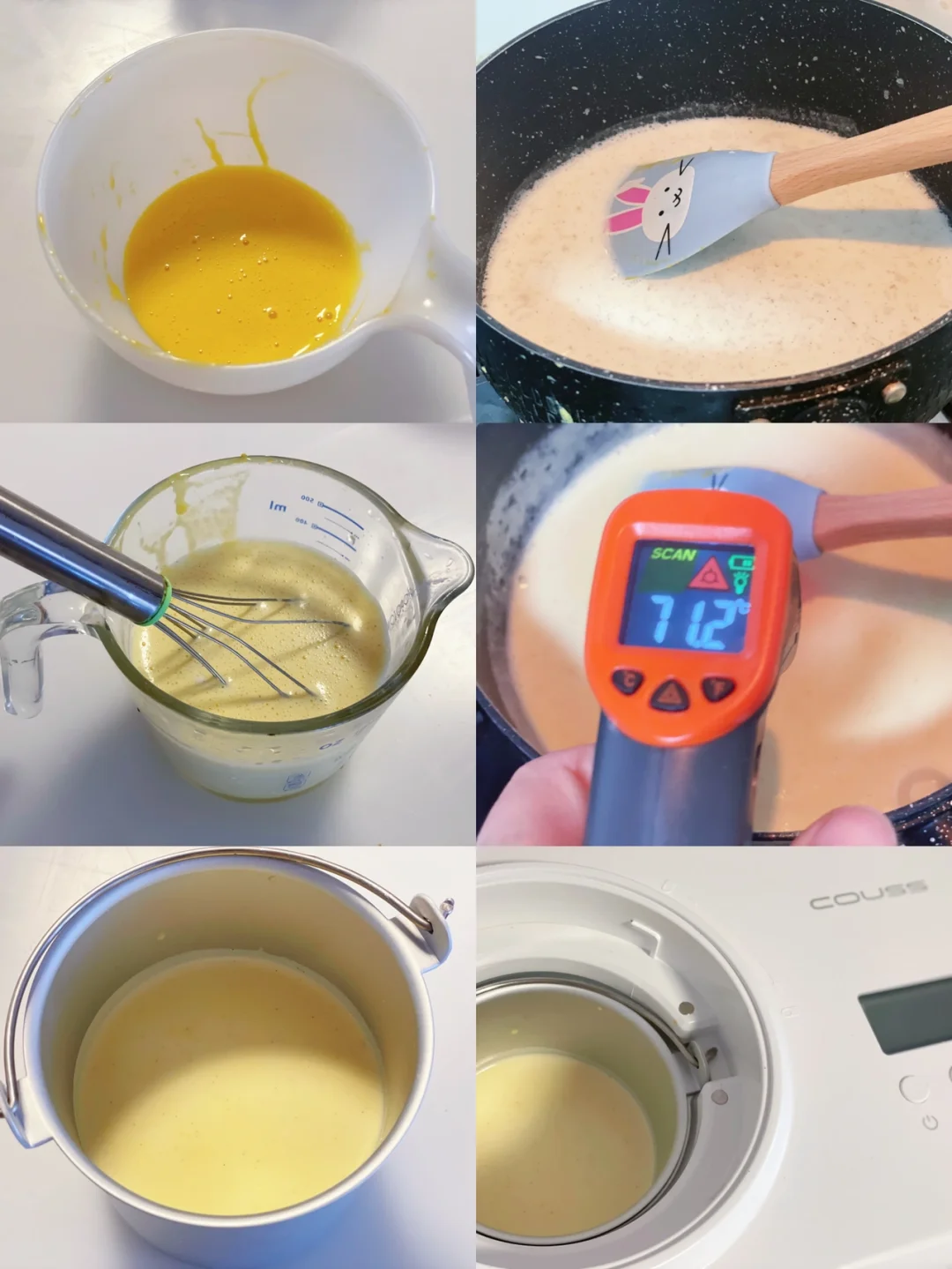 香草冰淇淋🍧:蛋黄2个|细砂糖30g|牛奶120g|淡奶油180g|炼乳15g|香草膏3g