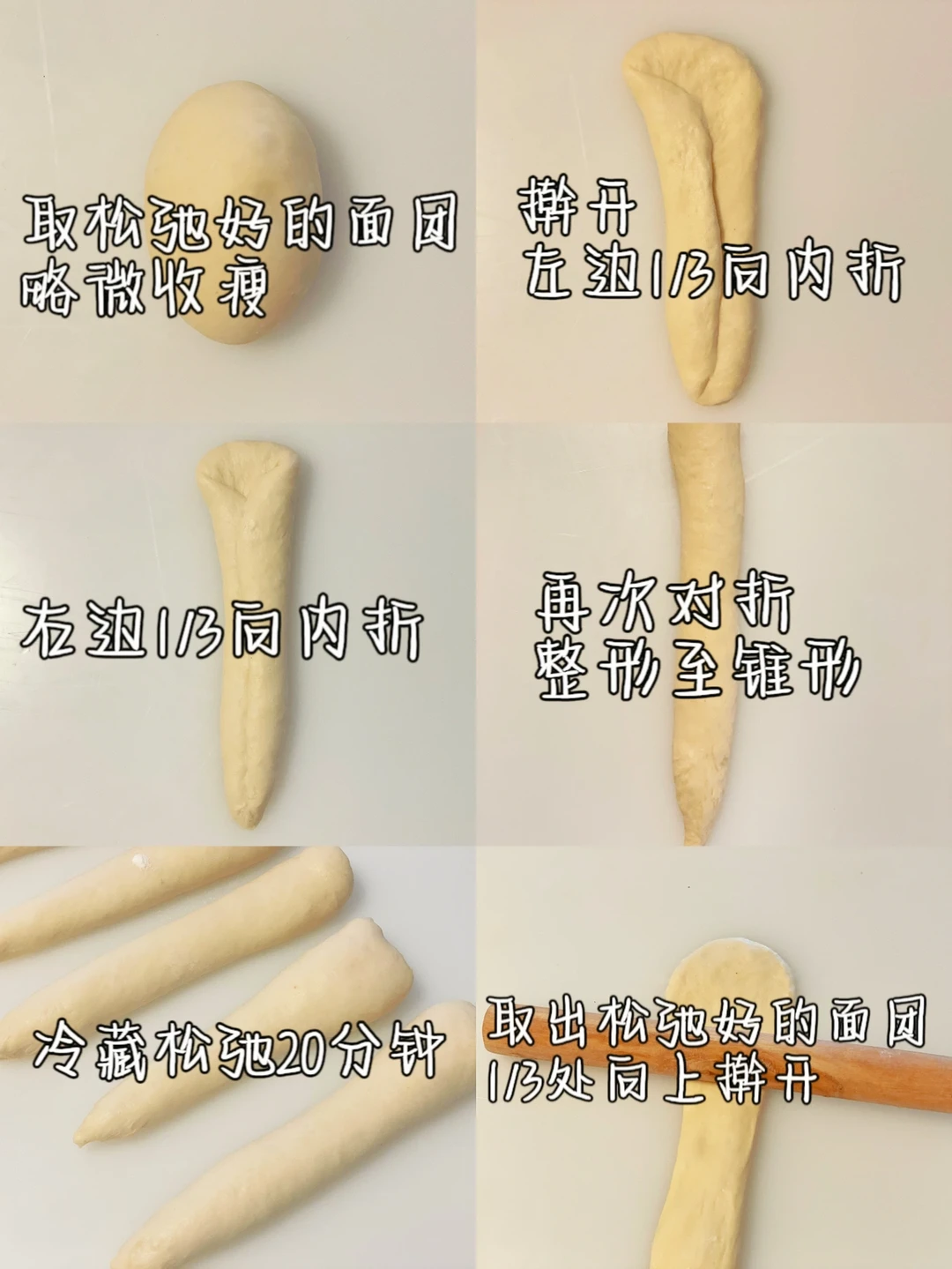 5⃣️取出松弛好的面团,中间收瘦擀开,左右1/3处分别向内折呈扇形,再次对折呈锥形,继续冰箱冷藏松弛20分钟