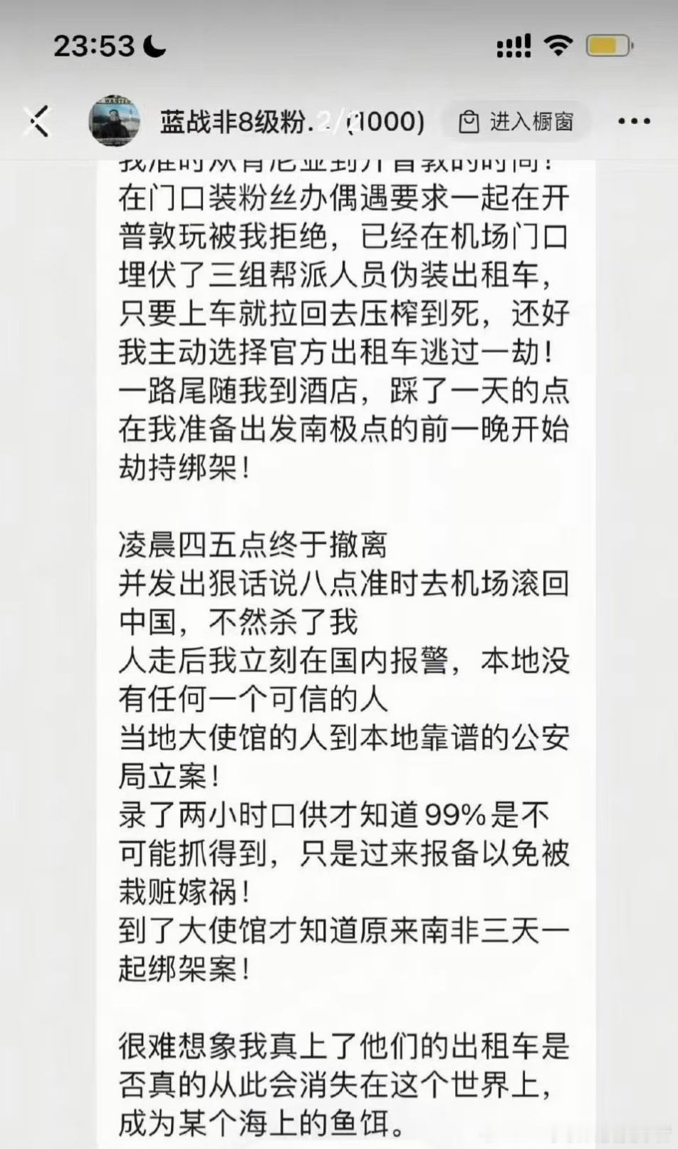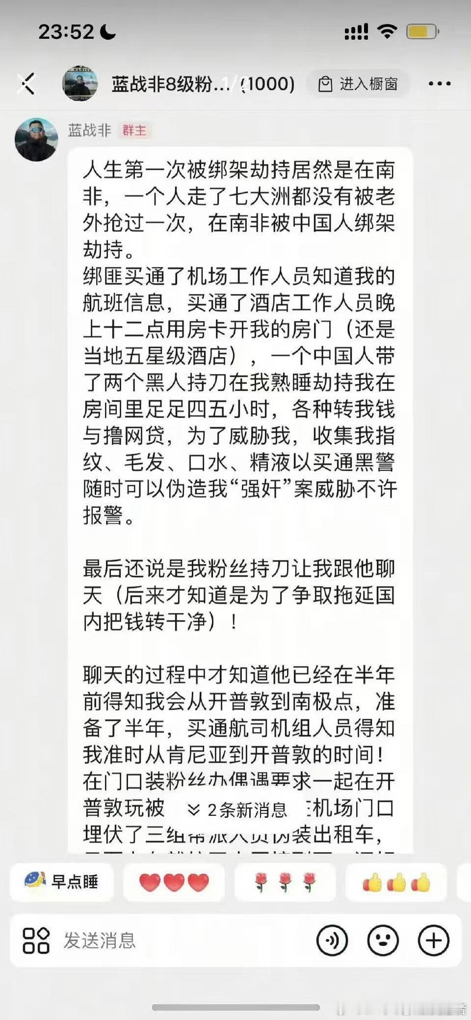LH手机科技爱好者看到了热搜和群里网友发的消息,说知名主播蓝战非在南非被绑架,过程挺吓人的。当地的治安环境太差了,出门旅游还是需要注意安全,有些人为了钱啥事都干的出来。蓝战非被绑架