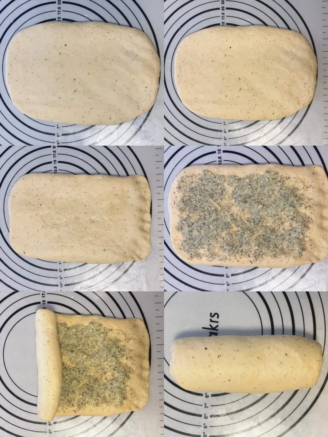 6⃣️擀开至长方形,翻面打薄底部;涂抹一层奶酥馅,从上而下卷起