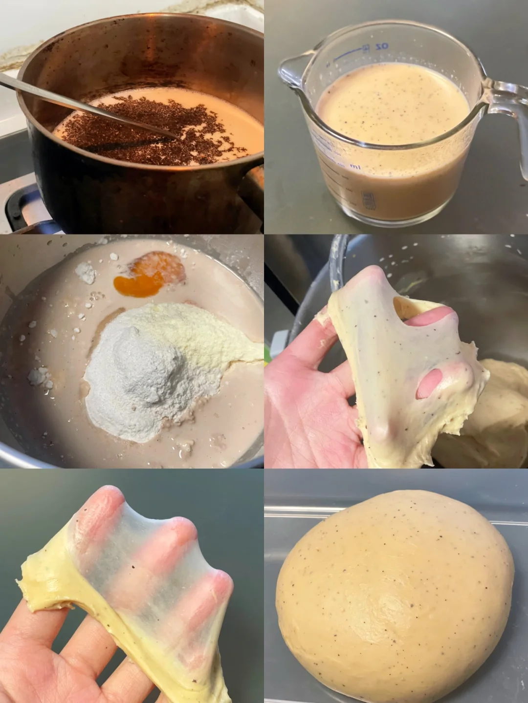 1⃣️提前一晚准备奶茶;将面包体配方中的牛奶与茶一起煮沸晾凉备用,保鲜膜密封冰箱过夜