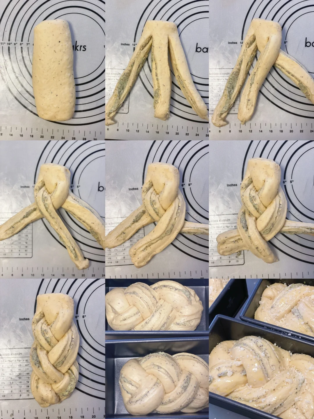 7⃣️将卷略微擀扁,拿刀切成三条头不切断,编辫子至末端捏紧,首尾向下折放入吐司盒。