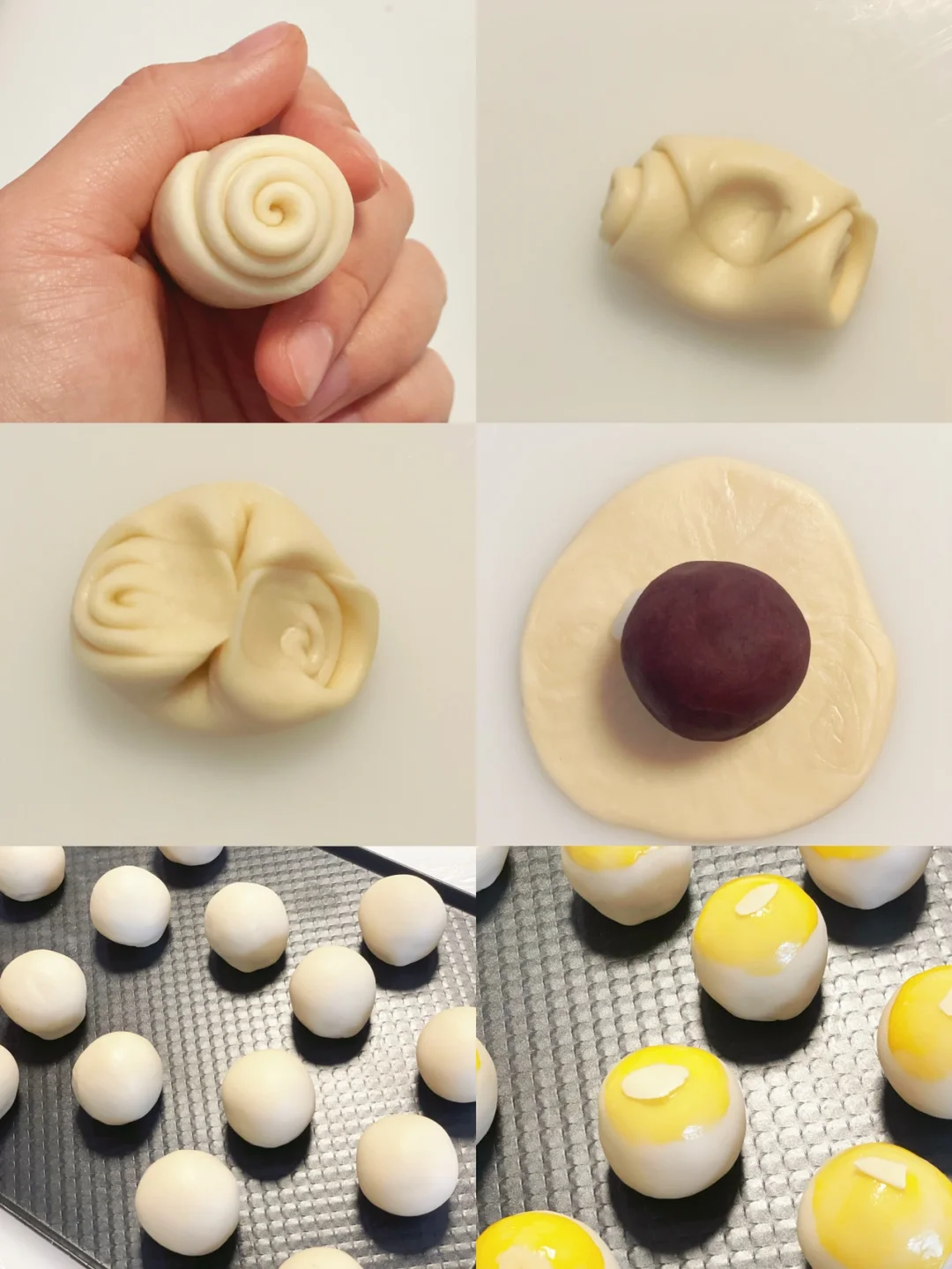 7⃣️松弛15分钟;中间拇指摁一下;两头对折再压扁;上下左右各擀一次;呈圆形。放入豆沙蛋黄馅,用虎口往上推收口,收口捏成揪揪,防爆口。