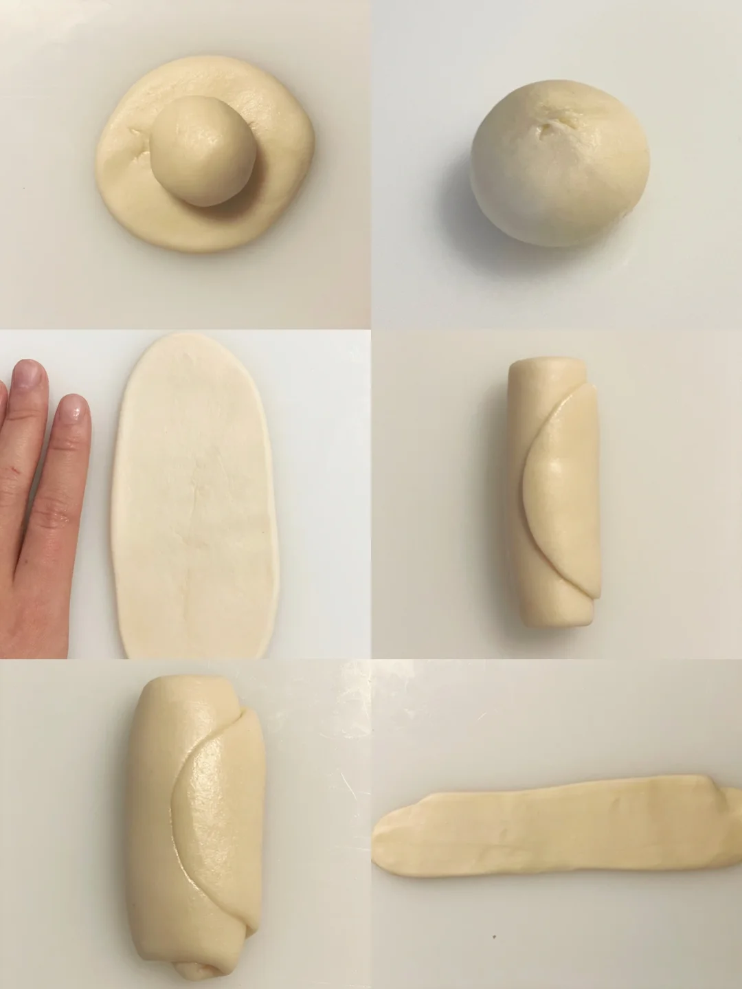 5⃣️松弛15分钟;收口朝上略微拍扁,擀面杖上擀一次下擀一次,请勿来回擀,卷起