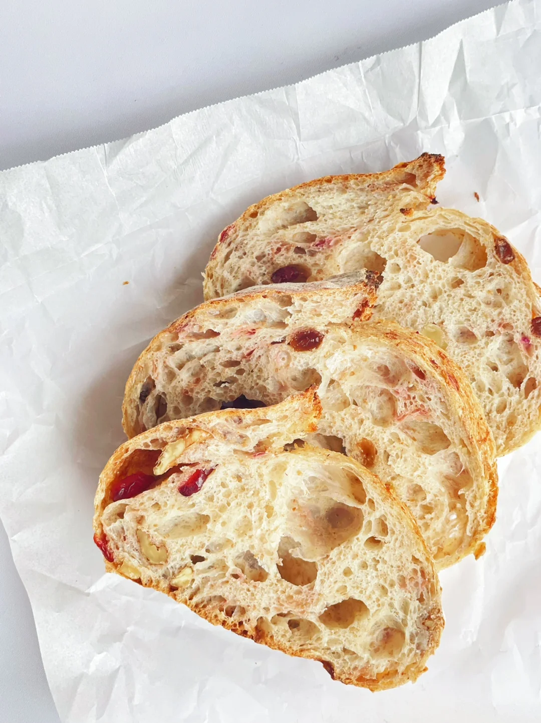 📎 组织不好/气孔小是因为面团没发到位/发过了,第一次发酵是隔夜发酵:判断发酵程度为底部大气孔;第二次发酵判断发酵到位可以用手指蘸干粉轻戳,面团应缓慢回缩。整形手法需轻柔,无需排气,轻拍大气泡即可