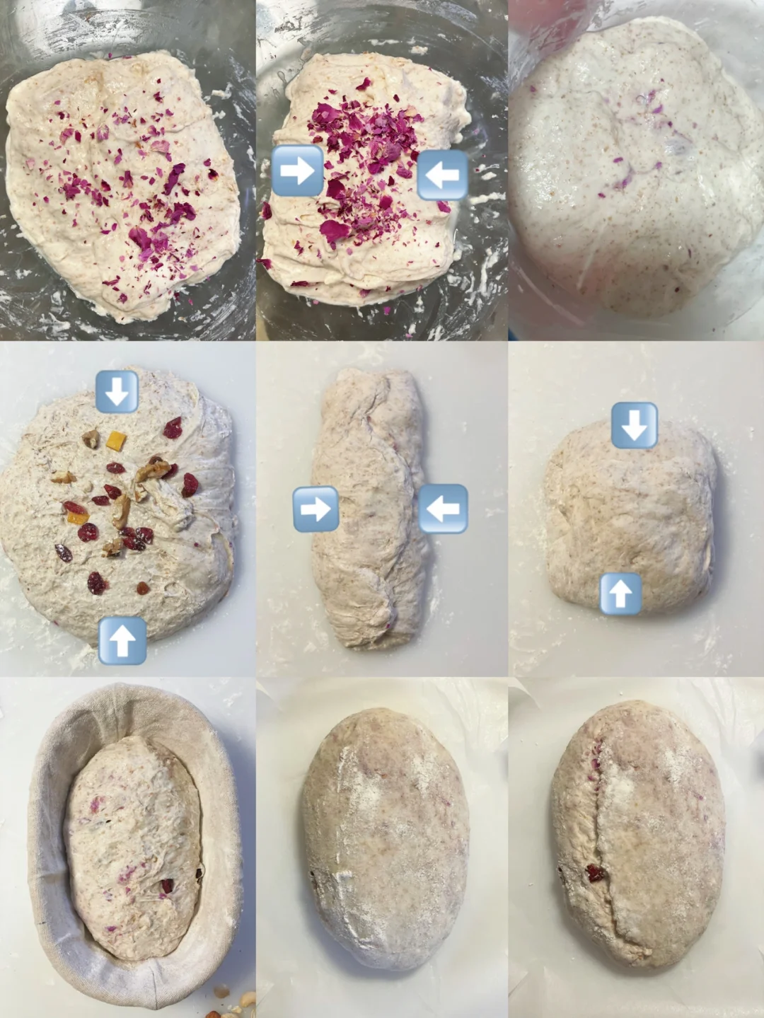 7⃣️案板撒上面粉倒扣将面团取出,手沾粉将面团上下对折一次捏紧左右放入果干果仁对折一次捏紧再横向对折一次整形至椭圆形,放入撒粉的发酵篮中室温发40分钟